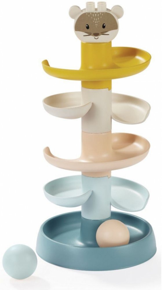 Věž k sestavení pro nejmenší v jemných barvách s míčky a hlavou medvídka na vrcholu. Trénuje motoriku a koordinaci dítěte.