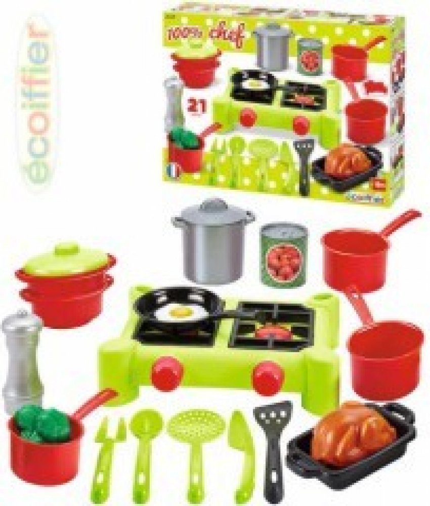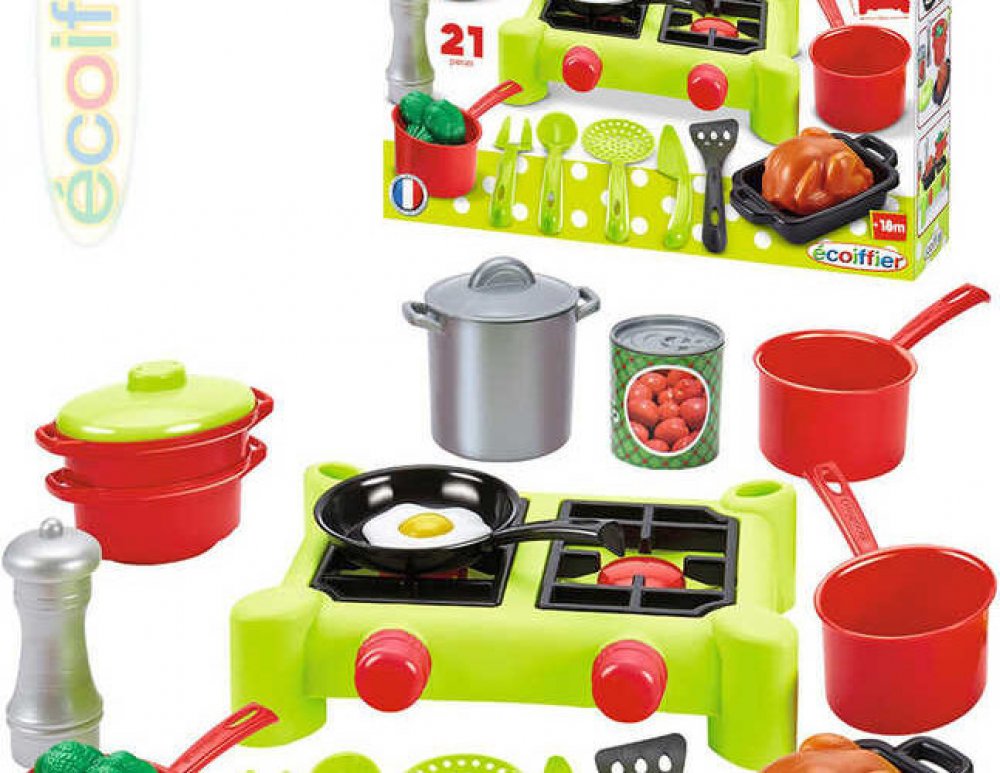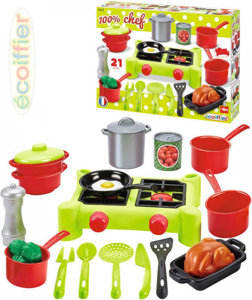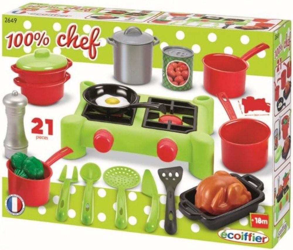 Dětský sporák 100% Chef Écoiffier je krásná hračka pro malé kuchtíky vhodná od 18 měsíců. Dětský sporák má zářivě zelenou barvu a 2 plotýnky, které jsou replikou opravdového kuchyňského sporáku. Na dětském sporáku si může váš malý kuchtík navařit polévku nebo upéct třeba vajíčko. Součástí balení je sada hrnců a potřeb do kuchyňky spolu s potravinami. Najdete zde celkem 21 doplňků, ke kterým patří ...
