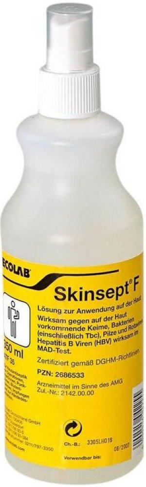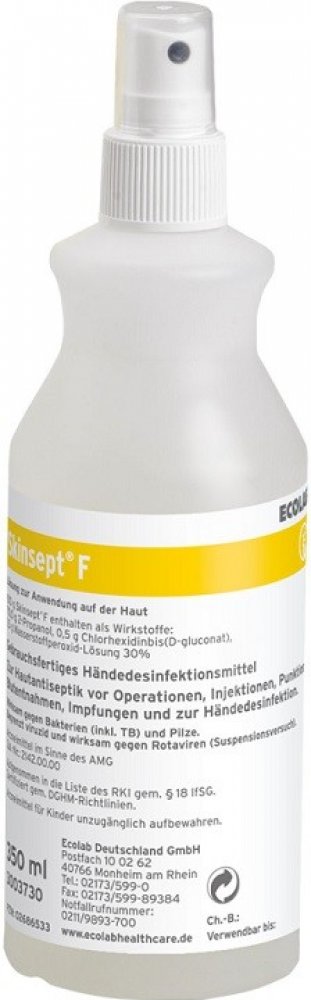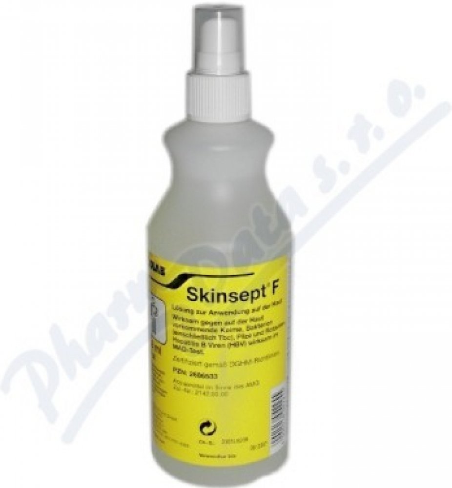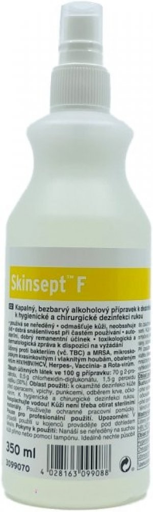 Vysoce účinný bezbarvý přípravek SKINSEPT F 350ml s určený k dezinfekce operačního pole a kůže před injekcemi, punkcemi apod. Neobsahuje jód. Neředí se.