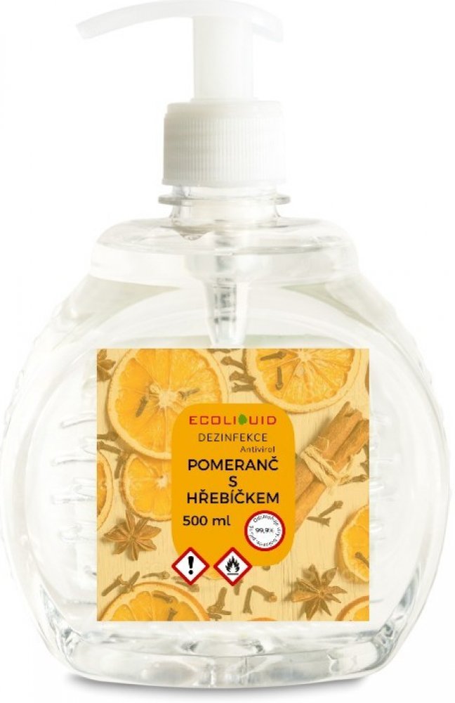 Ecoliquid Antiviral dezinfekce na ruce pumpička pomeranč + hřebíček 500 ml