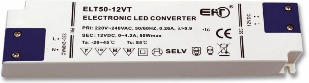 Ecolite El. trafo,230V-12V,4,2A,50W, 1,6mm,IP20 DX-WP-50W/SLIM