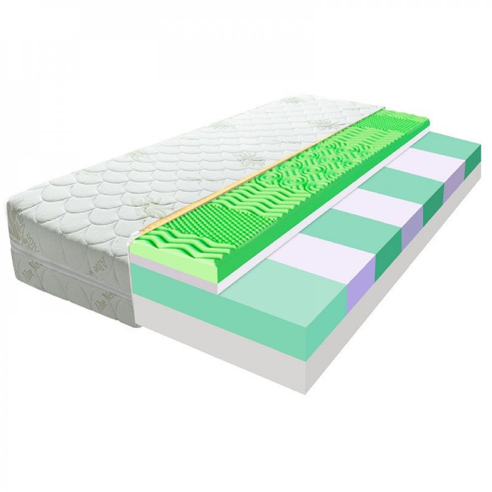 Sendvičová masážní matrace PARIS 18 cm Oblíbená sendvičová matrace vyrobená z kvalitních pěn. Složení matrace: profilovaná pěna T30/38, studená pěna HR Kaltschaum, PUR-pěna a T30/38, PUR-pěna T25/40 Charakteristika produktu: 7 zón vysoce kvalitní pěny T30/38 s technologií profiledFOAM zajišťuje správné uložení všech křivek těla, vrstva studené pěna HR KALTSCHAUM, které zajišťuje větší komfort a pohodlí jádro matrace tvoři 9-zónový systém ze studené pěna HR KALTSCHAUM a polyuretanové pěny T30/38 ,který ideálně se přizpůsobí Vašim křivkám a uvolní svalstvo během spánku Spodní vrstvu tvoří kvalitní tepelně zpracovaná PUR pěna T25, která poskytuje dostatečnou pevnost a odolnost matrace Odolný standardně prošívaný potah je hypoalergenní s výtažky Aloe Vera, má všitý zip, Matrace je oboustranná a obě strany jsou jiné. Jedna má masážní vlastnosti, zatímco druha je hladká. Sendvičová masážní matrace PARIS je vyrobena střídáním tří základních moderních komponentů, a to profilované pěny, vysoce pružné studené pěny Kaltschaum a PUR- pěny. Všechny pěnové materiály jsou na sebe kladeny sendvičovitě, čímž se zvedá životnost a komfort matrace. Studená pěna Kaltschaum tvoří střed matrace a zajišťuje její dokonalou pružnost . Polyuretanová pěna poskytuje matraci pevnost a odolnost, zatímco porézní profilovaná pěna je zárukou dostatečného provzdušnění. Matrace je oboustranná, masážní vlastnost má však jen z jedné strany, aby nedocházelo k nestejnoměrnému zatížení matrace, doporučujeme ji pravidelně otáčet. Střední tuhost matrace typu H3 patří do kategorie matrací vhodných k prevenci a předcházení bolesti zad . Výborně se přizpůsobuje obrysům těla a potřebám unaveného pohybového aparátu včetně páteře. Během spánku poskytuje celkové uvolnění, svalový tonus povoluje, proto je doporučovaná i při potížích s ploténkami. Vysoká elasticita zabraňuje proleženinám v místech s větší zátěží těla, jako jsou boky, ramena a oblast hlavy. Způsob balení matrace - v plném rozměru (nevakuovaná), ihned použitelná. Záruka 24 měsíce. Hypoalergenní potah je na dotek velmi příjemný, obohacený o výtažky z Aloe Vera , působí zklidňujícím efektem na podrážděné sliznice, vhodný i pro alergiky. Dobře hratelný, při pravidelné údržbě garantuje vysoký hygienický standard. Pro vyšší hygienu lůžka a snazší údržbu matrace doporučujeme používat chránič matrace . Sendvičové matrace jsou vhodné na lamelové rošty s větším počtem lamel nebo rošty laťkové. Doporučujeme zvolit vysoce kvalitní dobře pružící rošty, díky nimž si matrace udrží své skvělé anatomické schopnosti. K této matrace se hodí... Pro rozzáření vaší ložnice, rádi bychom Vám představili novou nabídku bavlněných a saténových povlečení , plyšových dek , které nenechají Vás odejít z naší stránky lhostejným. Něco do koupelny? Koupelnový textil je velmi důležitým doplňkem, který skvěle doladí vaši koupelnu. Máme pro Vás nabídku ručníku a osušek ! Upozorňujeme, že uvedené obrázky na našem eshopu jsou pouze ilustrační, barvy pěn se ve skutečnosti liší.