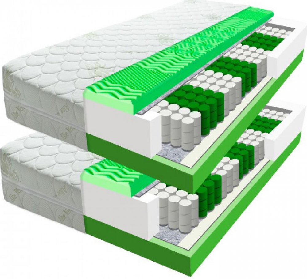 Taštičková matrace ZEUS Aloe Vera 21 cm. AKCE 1+1 Taštičková matrace ZEUS Aloe Vera s výškou 21 cm je ideální volbou pro ty, kteří hledají. Díky individuálně uloženým pružinám poskytuje tato matrace skvělou podporu těla, což minimalizuje přenos pohybu a zajišťuje klidný spánek. Aloe Vera v potahu přispívá k příjemnému pocitu na pokožce a má přirozené antibakteriální vlastnosti. Zvolte matraci ZEUS Aloe Vera pro dokonalou kombinaci pohodlí, kvality a péče o vaše zdraví. Složení matrace matrace ZEUS Aloe Vera: Profilovaná PUR pěna, PUR-pěna, plst 0.5 cm taštičkové jadro, plst 0.5 cm PUR-pěna Charakteristika produktu Taštičková matrace ZEUS Aloe Vera 21 cm, AKCE 1+1: 7 zón profilované PUR pěny T30/38 s technologií profiledFOAM zajišťuje správné uložení po celému tvaru těla, další vrstva z polyuretanové pěny pod vrstvou profilované pěny pro stabilitu matrace Matrace má tvrdost 7 zón pro optimální polohu a flexibility bodu při spánku. Taštičkové pružiny, každá samostatně potažená vysoce elastickým materiálem, celkem více než 289 pružin / m2 vytvořeno technologii extendedHard Filc, umístněný mezí taštičkovým jádrem a pěnou, zvyšuje pevnost matrace a také prodlužuje její životnost Matrace je oboustranná. Kromě toho obě strany se liší v tvrdosti, což přidává matraci více univerzálnosti. Jádro matrace střední tuhosti je vyrobeno z modernách a vysoce kvalitních taštičkových pružin. Pružiny jsou uloženy v taštičce z netkané textilie. Díky tomu se dokáže dokonale přizpůsobit křivkám Vašeho těla. 7 anatomických zón je tvořeno z měkčích a tvrdších pružinek, které jsou rozděleny tak, aby byla zajištěna co nejdokonalejší opora a udržení páteře v její optimální poloze. Tato matrace dokáže uspokojit i náročné zákazníky, kteří potřebují ortopedickou matraci vysoké kvality. Střední tuhost a 7 anatomických zón zajišťuje příjemné vstávání bez bolesti zad pro většinu našich zákazníků. Matrace je vhodná pro spaní v jakékoliv poloze. Potah je z hypoalergenní pevné tkaniny s všitým zipem ze tři stran. Všechny materiály použité pro výrobu jsou šetrné k životnímu prostředí a splňují přísné standardy kvality. Pro výrobu matrace jsme použili nejmodernější technologie - matrace řady profiledFOAM jsou charakterizované výjimečným pohodlí, trvanlivosti a také potřebným větráním. Pro jejich výrobu používáme jen ty nejkvalitnější suroviny, spojené ve vhodných podmínkách bezpečným vodivým lepidlem. Optimální přizpůsobení polyuretanových pěn je tajemstvím dobrého matrace, a v souladu s nejnovějšími standardy spánku jsou doporučené lékaři a odborníky. Jádrem matrace je taštičkový systém technologii extendedHard. Takové matrace mají dlouhou životnost a dokonale se přizpůsobuji k hmotnosti Vašeho těla. Použiti taštičkových pružiny dělí matraci na 7 zón s různé tvrdostí. Kromě toho, není žádné spojení mezi pružinami, každá pracuje nezávisle na ostatních, čímž pod tlakem na malou plochu se eliminuje následek pohybu na povrchu velké plochy. Jen Vy rozhodnete, zda chcete večer užít vlastnosti masáže na profilované sráně, nebo si raději vyspát na tvrdším povrchu s hladkou pěnou. Jedná se o univerzálnost tohoto výrobku. Nezávisle na použité straně, po celou dobu matrace zabezpečuje ideální polohu po čas Vašeho spánku a odpovídající obrys těla při odpočinku. Taštičkovou matraci doporučujeme umístit na pevnou desku, laťový rošt nebo pevný lamelový rošt s mezery do 6 cm. Způsob balení matrace - v plném rozměru (nevakuovaná), ihned použitelná. Záruka 24 měsíce. Potah matrace ZEUS Aloe Vera Potah matrace ZEUS Aloe Vera je navržen tak, aby poskytoval maximální komfort a hygienu pro váš spánek. Tento moderní potah je vybaven výtažky z Aloe Vera , které nejenže zajišťují svěží a příjemné prostředí, ale také přirozeně zamezují výskytu plísní a bakterií . Díky svým antialergickým vlastnostem je potah ideální volbou pro alergiky a osoby s citlivou pokožkou, protože účinně chrání před alergeny a přispívá k udržení čisté a zdravé matrace . Potah umožňuje rychlý odvod potu a pomáhá udržet matraci suchou a