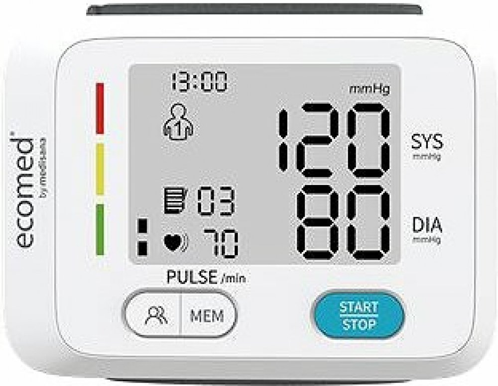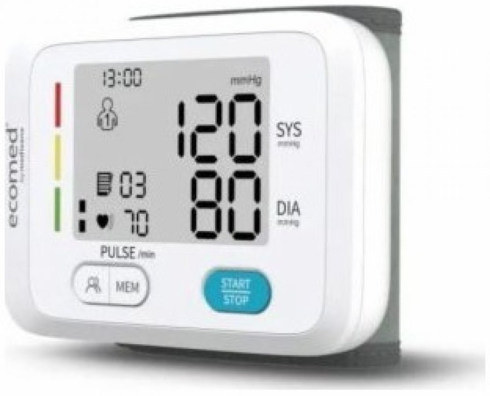 Ecomed BW 83E pomocí barevné škály semaforu vyhodnotí měření Vašeho krevního tlaku. Tlakoměr na zápěstí mohou využívat 2 uživatelé, naměřené hodnoty lze uložit pro každého zvlášť až 90x. Praktické je velký a čitelný LCD displej, který zobrazuje systolu, diastolu, puls, datum, čas a stav baterie. Ecomed 23717 vypočítá průměrnou hodnotu posledních 3 uložených hodnot a také zobrazí nepravidelný srdeč...