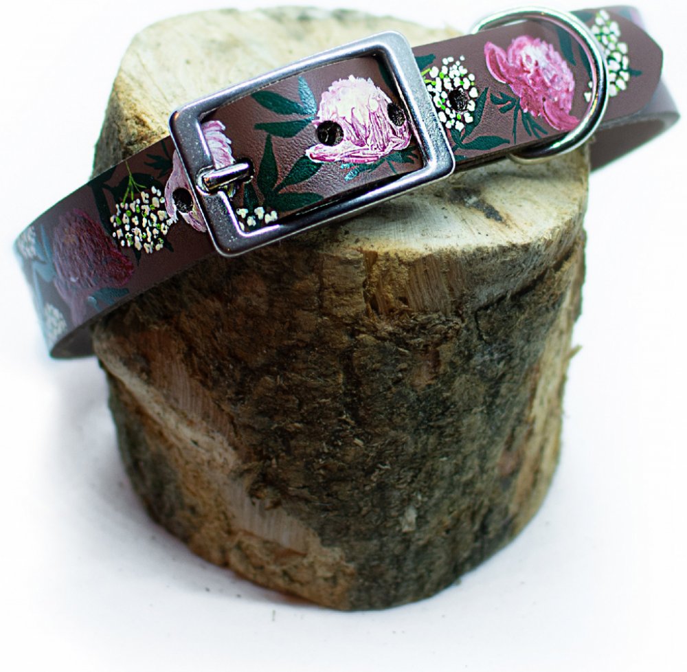 Kožený obojek "pivónie i řebříček"