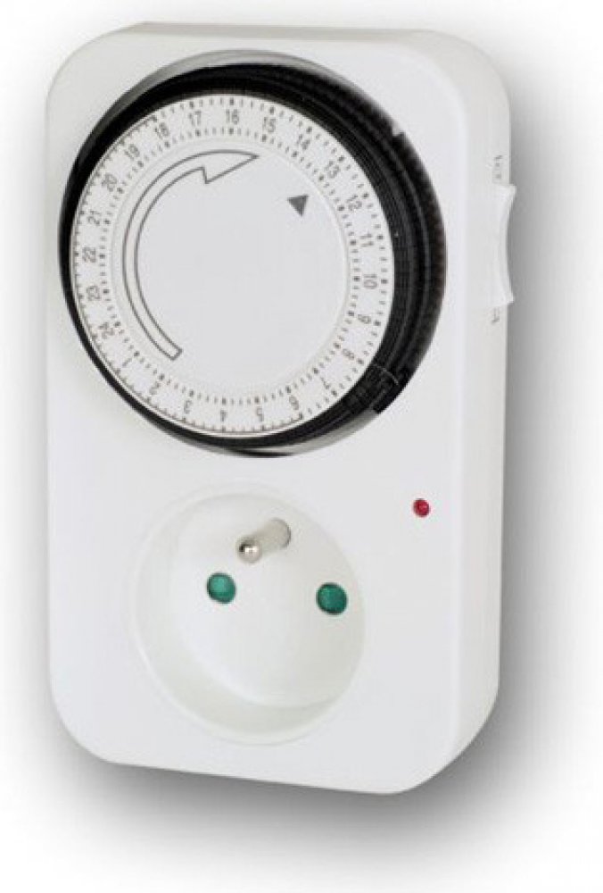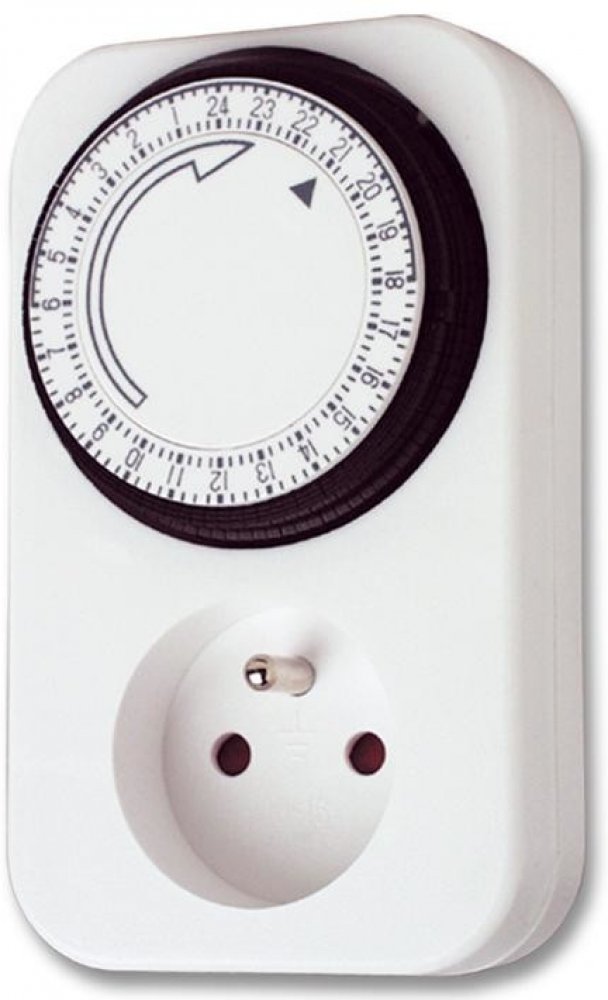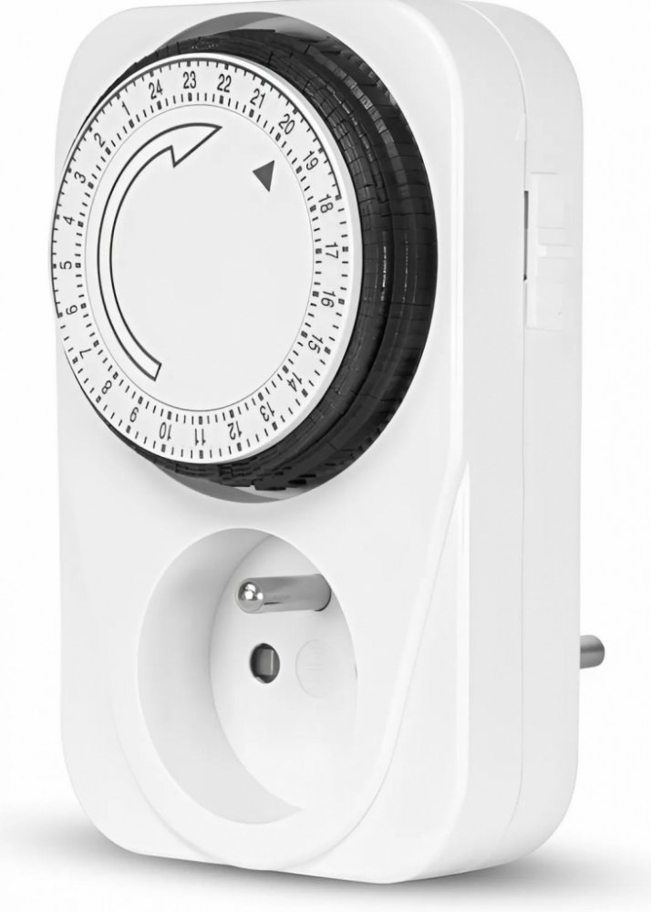 Mechanický časový spínač bílé barvy, který lze nastavit v rozmezí 15 minut až 24 hodin.