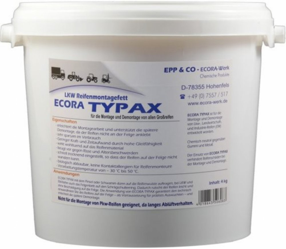 Montážní pasta-vazelína TYPAX pro nákladní pneu, 4kg.Pasta určená především pro nákladní, agro a EM pneumatiky. Extrémní mazací schopnost, speciálně vyvinutá pro pneu, kde je třeba delší čas při montáži.