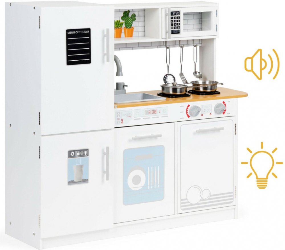 Dřevěná kuchyňka pro děti s příslušenstvím Pro děti od 3 let. Stabilní, bytelná konstrukce. LED podsvícení. Otočné „cvakající“ knoflíky. Otevírací trouba, mikrovlnka, skříňka a lednice. Pohyblivá baterie. Další kovové kuchyňské doplňky. Produkt značky...