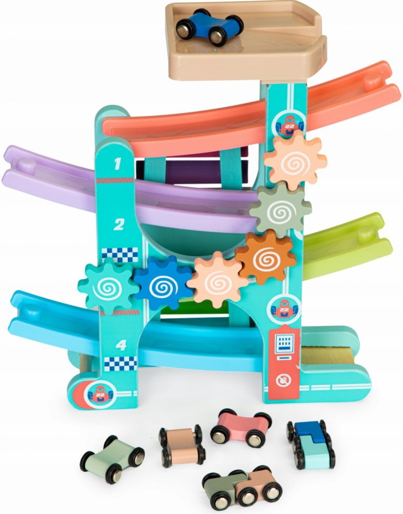 Hlavním lákadlem hračky je skluzavka, na které může dítě ze startovací plošiny spouštět autíčka připojená k sadě. Každé ze 6 aut má jinou barvu, takže vaše batole si bude moci uspořádat vlastní závody! Značení dráhy namalované na boku pomůže sledovat auta.