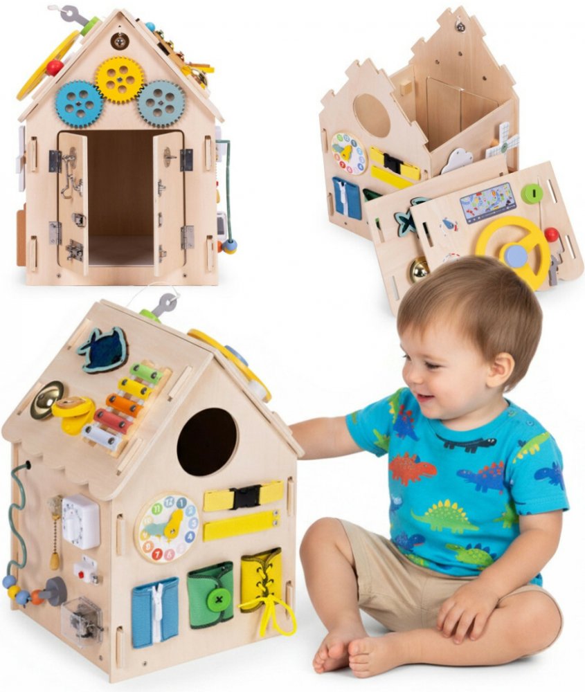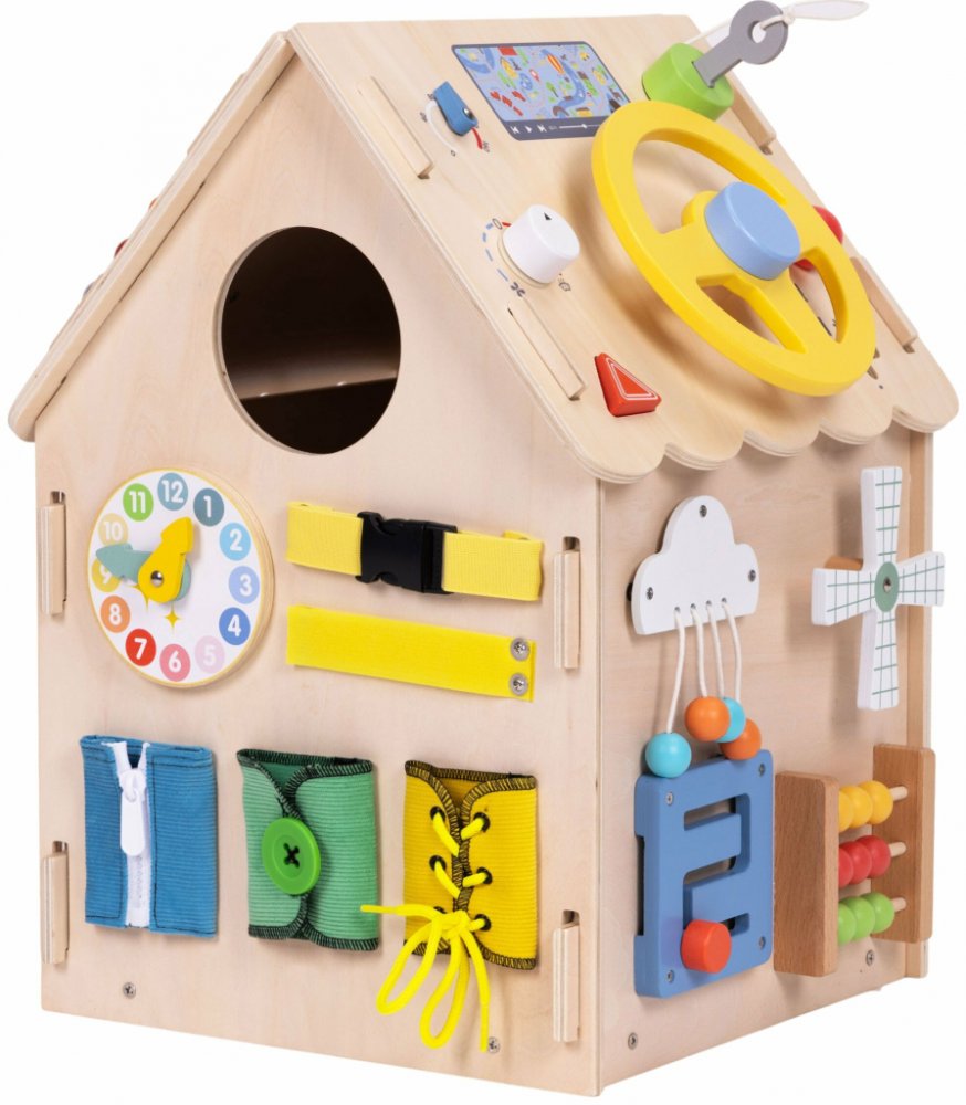 Domek nabízí bohatou škálu činností, které rozvíjejí jemnou motoriku, koordinaci oko–ruka i trpělivost. Najdete zde například. Počítadlo pro první počítání. Ozubená kola a převody. Hodiny s pohyblivými ručičkami. Přepínače a otáčecí knoflíky. Zvoněk a pozitivka. Volant a řadicí páka. Senzorická rybička s flitry. Bludiště a posuvné prvky. Otevírací dvířka s různými zámky a závorami. Zapínání na suchý zip, přezku, sponu a šněrování. Cimbálky, kovový talerz a zvonek. Děti mohou libovolně zkoušet, kombinovat a vracet se k oblíbeným prvkům. Každý úspěch posiluje sebevědomí a chuť objevovat další možnosti. Bezpečnost a důležité informace.