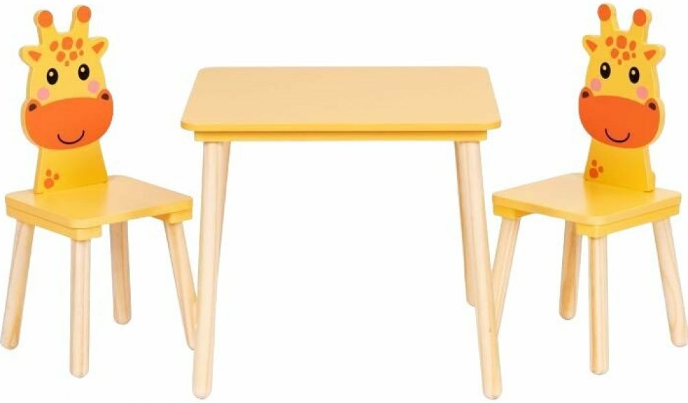 Sada obsahuje dvě pohodlné židle navržené pro ergonomii a pohodlí nejmenších dětí. Jejich rozměry jsou dokonale přizpůsobeny výšce stolu, což umožňuje dítěti udržet správné držení těla při sezení a zajišťuje plnou volnost pohybu - jak při hře, tak při učení. Opěradla ve tvaru žirafy upoutají pozornost a vnesou do dětského pokoje radostnou, přátelskou atmosféru. SPECIFIKACE