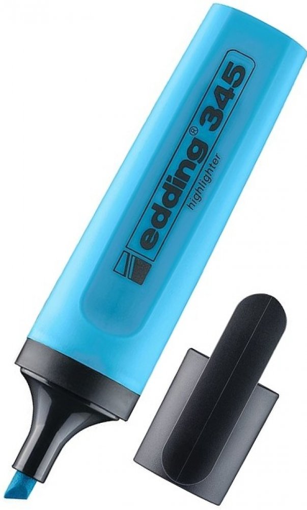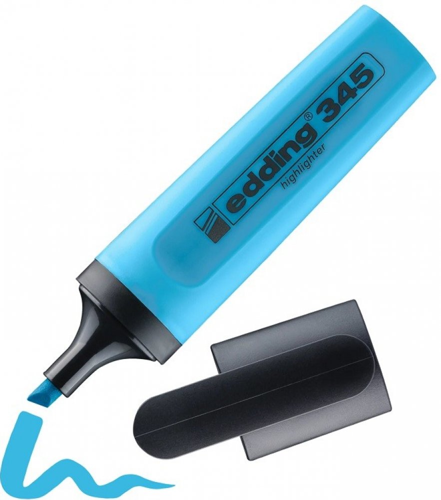 Značkovač. Edding 345 zvýrazňovač Zvýrazňovač zvláště vhodný pro značení a zvýraznění míst v textu a poznámek, například v dopisech, protokolech, tabulkách, knihách, časopisech, prospektech, jízdních řádech, atlasech, jakož i všech samopropisujících a faxových papírech. Edding 345 je zvýrazňovač se seříznutým hrotem. Obsahuje inkoust na bázi vody a je znovu naplnitelný. Šíře stopy: 2 - 5 mm Zvýrazňovač je znovu naplnitelný Inkoust je na vodní bázi Průměr uzávěru je větší než 16 mm, takže podle ISO 11540 není ventilační uzávěr potřebný Dostupný v barvách: žlutá, zelená, oranžová, růžová, modrá a také v sadách po 4 a 6 kusech. Sada 6 ks obsahuje navíc šedý zvýrazňovač, který je obzvláště vhodný při přípravě fotokopií. Zvýrazňovaný text i vlastní zvýrazňování jsou stále velmi dobře čitelné i na fotokopiích. Šedá barva značkovače je také vhodná pro diskrétní zvýraznění textu.