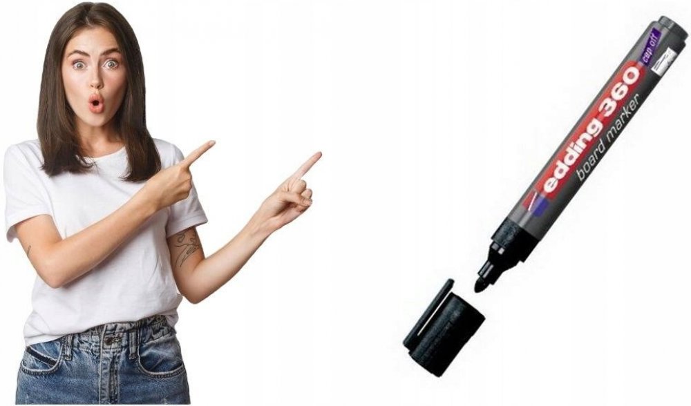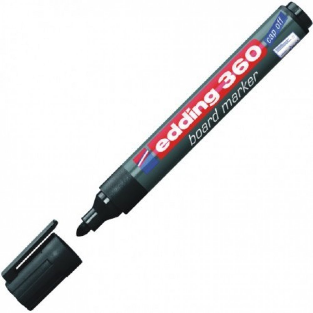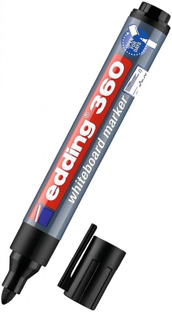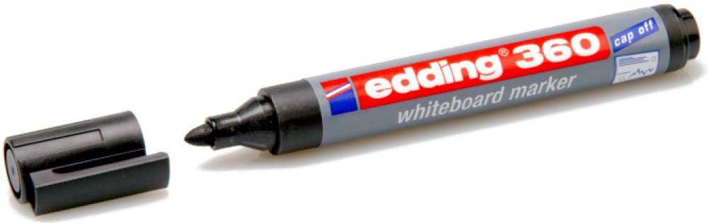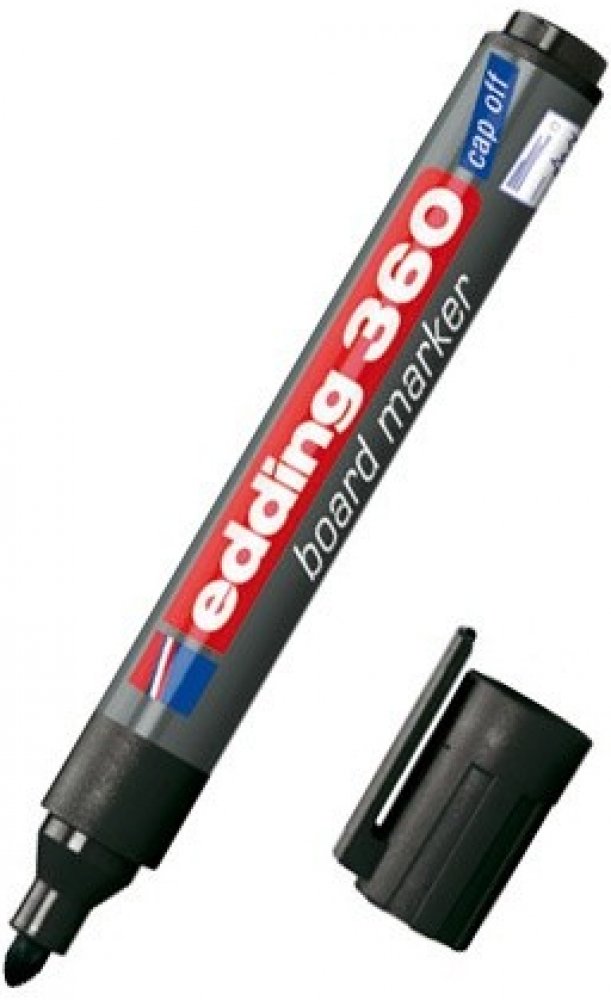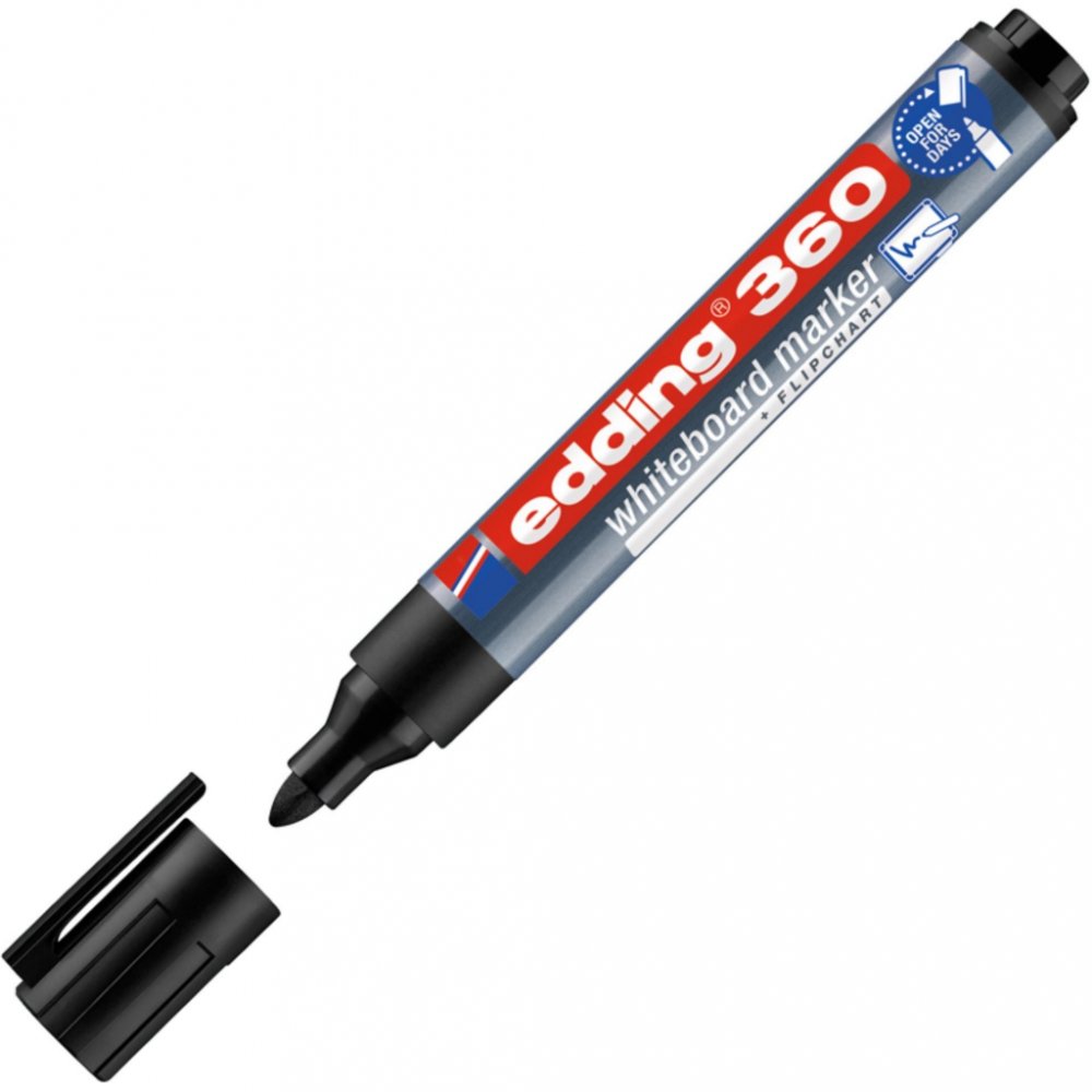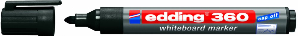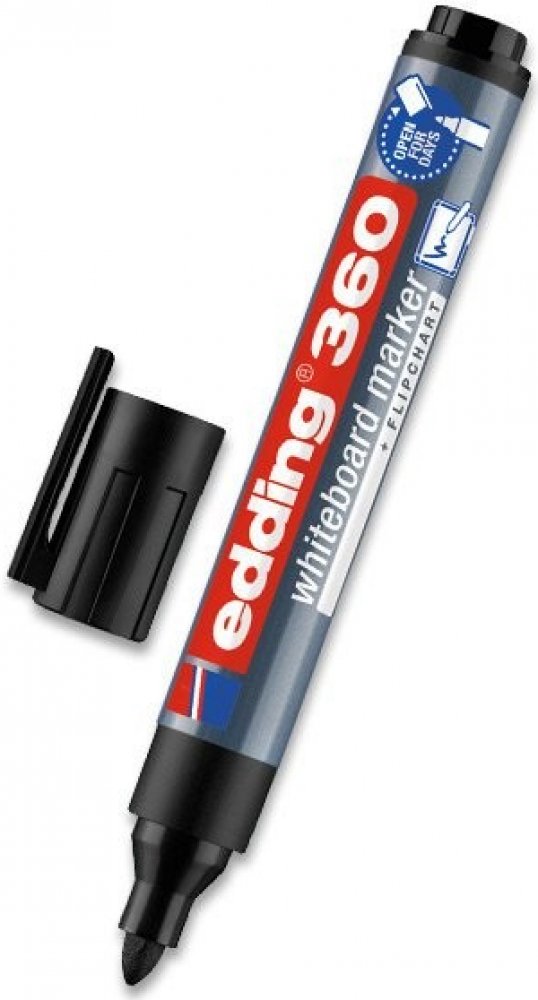 S popisovačem Edding 360 se Vám bude skvěle psát na whiteboard (bílou tabuli) nebo na flipchart. Je vhodný také na hladké skleněné, melaminové nebo emailové povrchy. Můžete si vybrat z několika barev. Je rychleschnoucí a má kulatý hrot pro rovnoměrný tah. Zapomenete-li popisovač otevřený, neobávejte se, že by hrot zaschl. Díky technologii „cap-off“ ho lze nechat bez víčka i několik dní (testováno podle normy ISO 554). Barva popisovače není náchylná ke změně při dlouhodobém vystavení světlu. Psaní snadno smažete suchou cestou, vezměte tedy suchý hadřík nebo jemnou houbičku a setřete. Má kulatý hrot 1,5-3 mm. Rychleschnoucí. Inkoust má slabý zápach. Edding 360 je možné znovu plnit pomocí Edding BTK 25