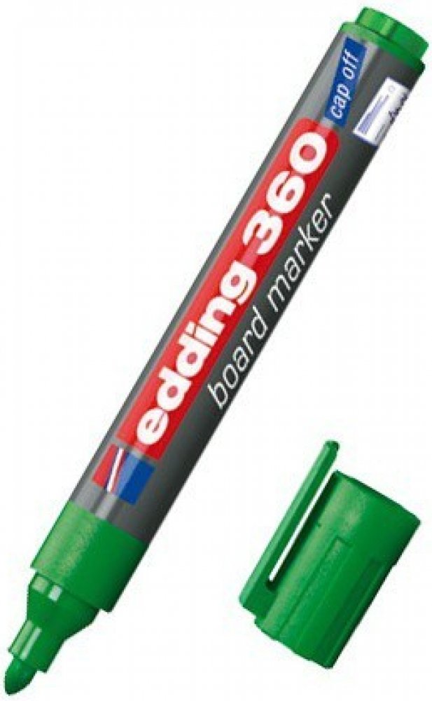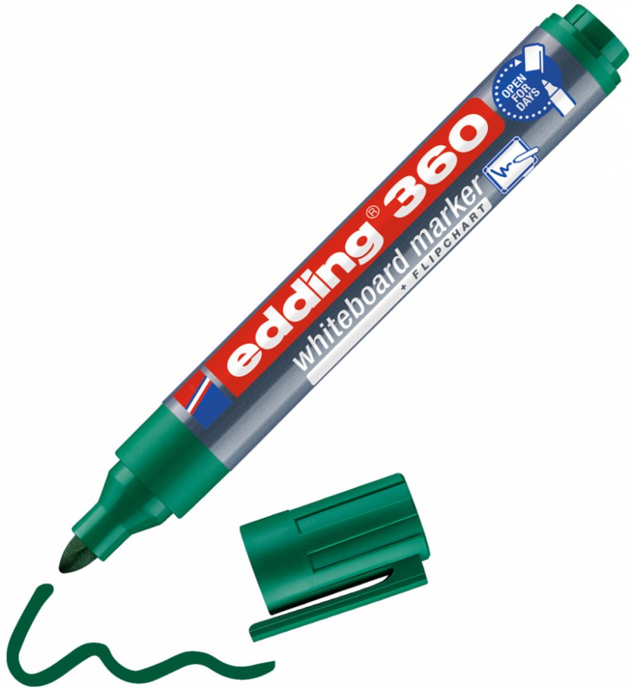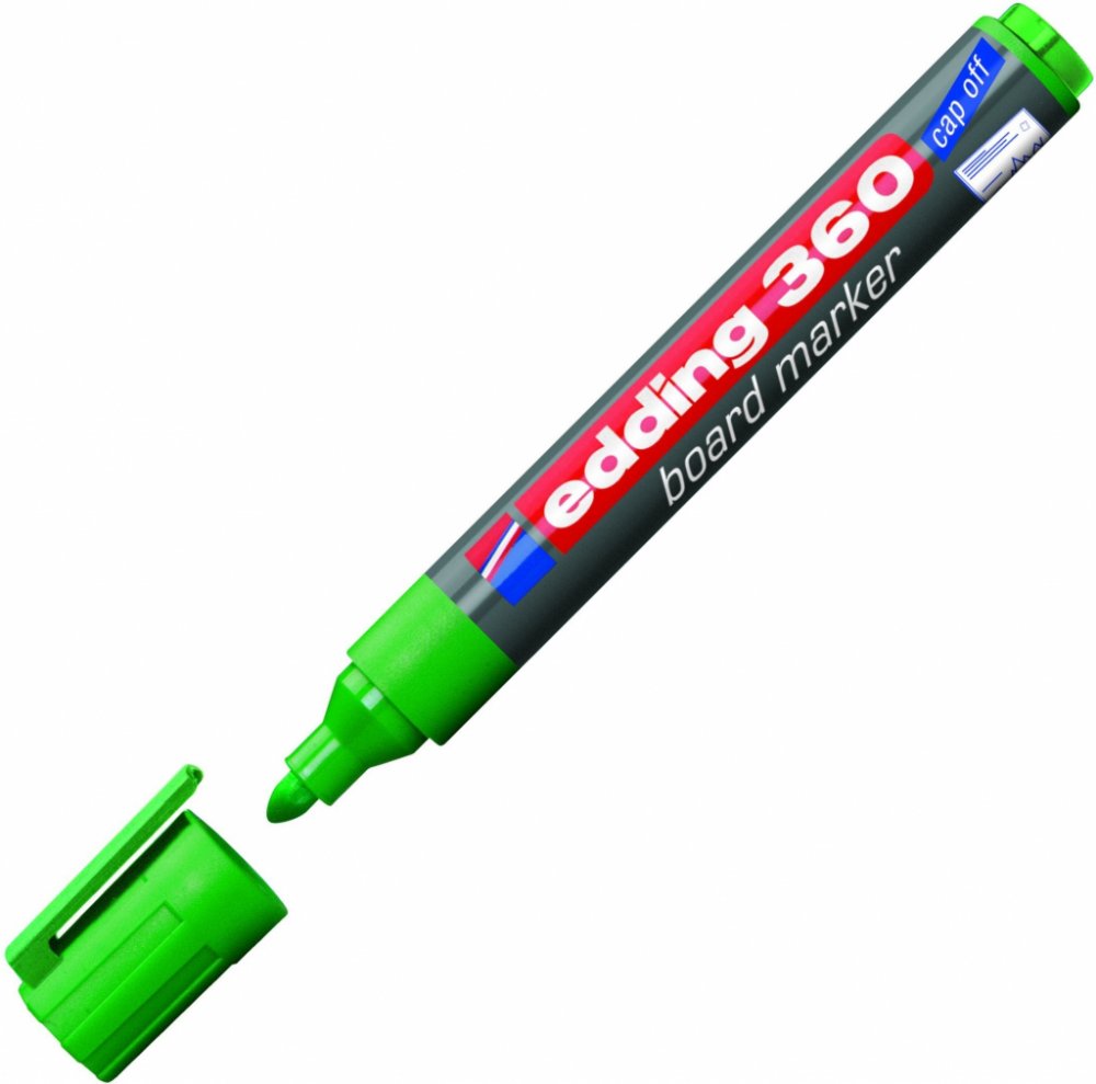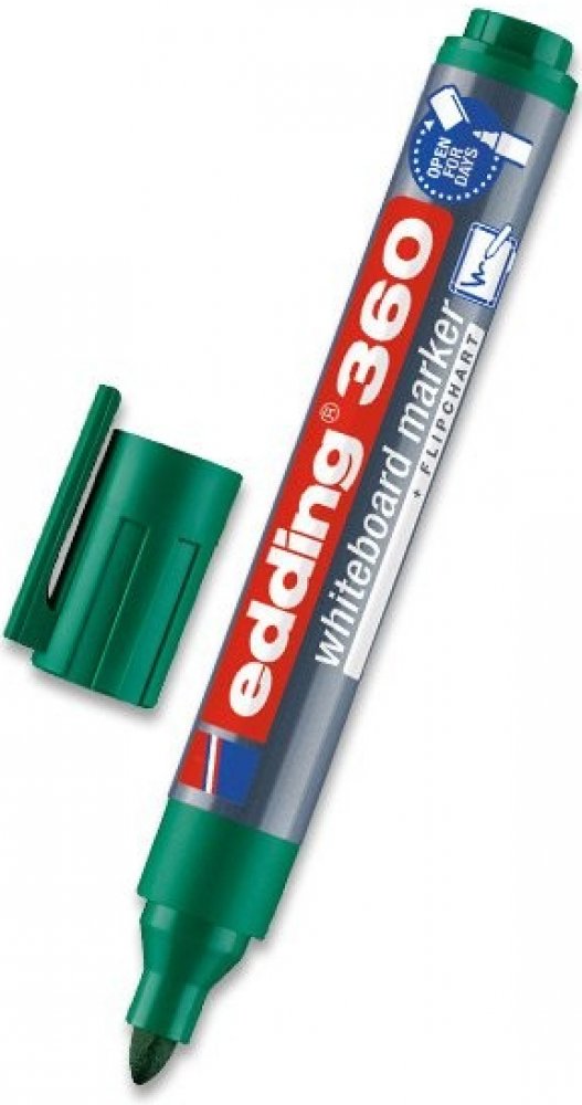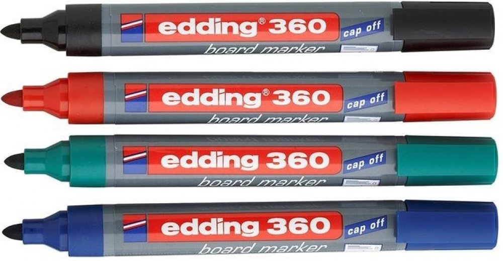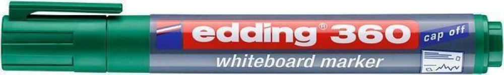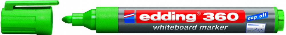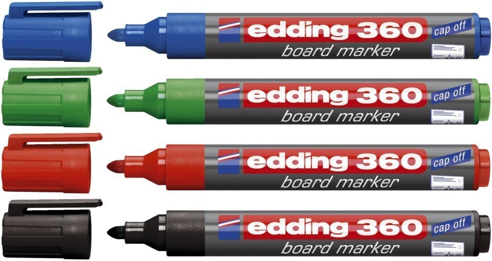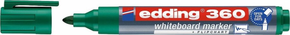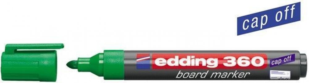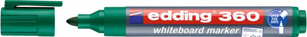 S popisovačem Edding 360 se Vám bude skvěle psát na whiteboard (bílou tabuli) nebo na flipchart. Je vhodný také na hladké skleněné, melaminové nebo emailové povrchy. Můžete si vybrat z několika barev. Je rychleschnoucí a má kulatý hrot pro rovnoměrný tah. Zapomenete-li popisovač otevřený, neobávejte se, že by hrot zaschl. Díky technologii „cap-off“ ho lze nechat bez víčka i několik dní (testováno podle normy ISO 554). Barva popisovače není náchylná ke změně při dlouhodobém vystavení světlu. Psaní snadno smažete suchou cestou, vezměte tedy suchý hadřík nebo jemnou houbičku a setřete. Má kulatý hrot 1,5-3 mm. Rychleschnoucí. Inkoust má slabý zápach. Edding 360 je možné znovu plnit pomocí Edding BTK 25