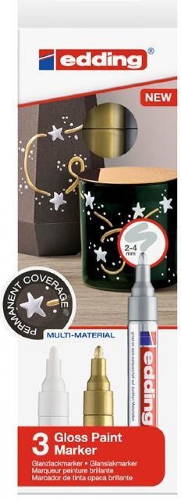 Lesklý fix na barvy 750 creativepermanentní, málo zapáchající, krycí inkoust podobný barvě bez přídavku xylen-toluenu, voděodolný, odolný vůči teplu do 400°.Kulatý hrot, vyměnitelný hrotTěsnicí fólie. Víčko a náustek v barvě pro psaní. Označení na tubusu obsahuje piktogramy, které vysvětlují, jak aktivovat popisovače barvou. Extrémně odolné vůči světlu. Vysoce krycí i na tmavých površích.Materiál dříku: hliníkBarva dříku: bílá nebo psací barvaŠířka čáry: 2 - 4 mmBarva písma: bílá, zlatá, stříbrnáLesklý popisovač pro vysoce krycí, trvalé a nerozmazatelné psaní a zdobení na hladké a dokonce i tmavé a průhledné materiály, např. sklo, kov, plast a natíraný papír. Kulatý hrot má šířku čáry 2-4 mm. Pigmentový inkoust připomínající barvu rychle zasychá, je odolný vůči povětrnostním vlivům a extrémně světlu, málo zapáchá a je odolný proti oděru. Sada obsahuje barvy bílou, zlatou a stříbrnou. Ve vysoce kvalitním pouzdře pro opakované použití. K dispozici jsou náhradní hroty. Inkoust má nízký zápach a neobsahuje přidaný toluen/xylen. Vysoce kvalitní hliníkové tělo. Lesklý fix na barvy creative 750permanentní, málo zapáchající, krycí inkoust podobný barvě bez přídavku xylen-toluenu, voděodolný, odolný vůči teplu do 400 stupňůKulatý hrot, vyměnitelný hrotTěsnicí fólie. Průběžné značení obsahuje piktogramy, které vysvětlují, jak fixy s barvou aktivovat. Extrémně odolné vůči světlu. Vysoce krycí i na tmavých površích. Přilne k hladkým a porézním povrchůmMateriál hřídele: hliníkBarva dříku: v barvě písmaŠířka čáry: 2 - 4 mmBarvy písma: bílá, zlatá, stříbrná edding 750 lesklý popisovač - bílý, zlatý, stříbrný (metalický) - sada 3 popisovačů - kulatý hrot 2-4 mm - popisovač na sklo, kámen, dřevo, plast a papír - voděodolný, vysoce krycí