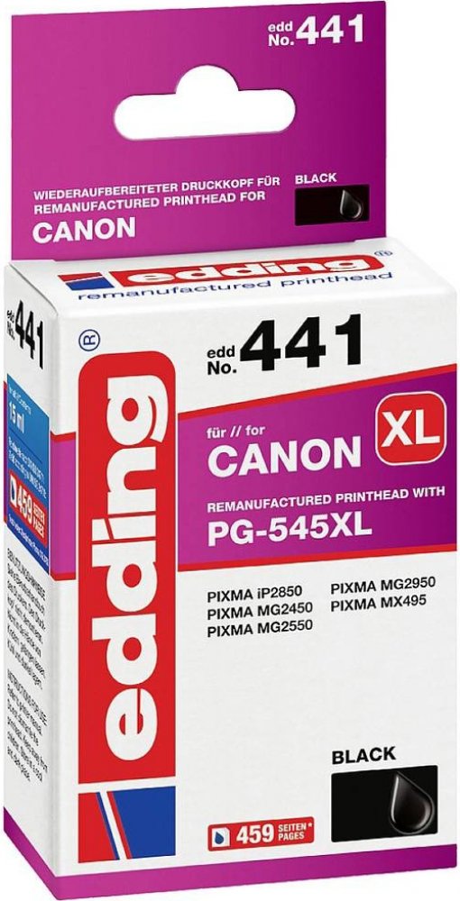 Patrona do tiskárny Edding EDD-441 nahrazuje Canon PG-545Dejte se do tisku na Edding kvalitu!Spolehlivá kvalita tisku a bezchybná funkce za atraktivní cenu - Edding nabízí kvalitní sortiment náplní do