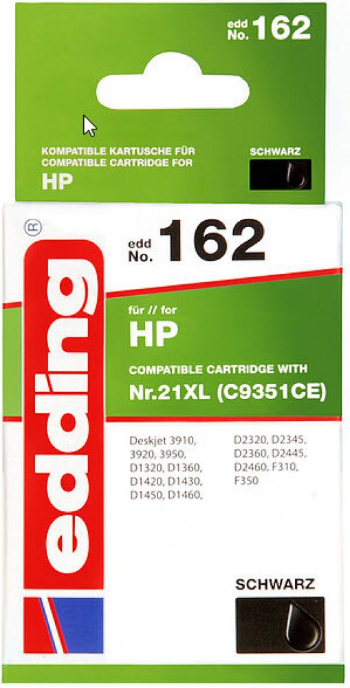 Model:KompatibilníTiskové barvy:ČernáKompatibilita značky:HPTyp napájení:Balení po jednomKompatibilita:HP Deskjet 3910 HP Deskjet 3920 HP Deskjet 3930 HP Deskjet 3940 HP Deskjet D1300 Serie HP Deskjet D1311 HP Deskjet D1320 HP Deskjet D1330 HP Deskjet D1341 HP Deskjet D1360 HP Deskjet D1368 HP Deskjet D1400 HP Deskjet D1420 HP Deskjet D1430 HP Deskjet D1445 HP Deskjet D1455 HP Deskjet D1460 HP Deskjet D1470 HP Deskjet D1490 HP Deskjet D1500 Serie HP Deskjet D1560 HP Deskjet D2300 Serie HP Deskjet D2320 HP Deskjet D2330 HP Deskjet D2345 HP Deskjet D2360 HP Deskjet D2368 HP Deskjet D2400 Serie HP Deskjet D2430 HP Deskjet D2460 HP Deskjet F300 HP Deskjet F310 HP Deskjet F325 HP Deskjet F335 HP Deskjet F340 HP Deskjet F350 HP Deskjet F370 HP Deskjet F375 HP Deskjet F378 HP Deskjet F380 HP Deskjet F385 HP Deskjet F388 HP Deskjet F390 HP Deskjet F394 HP Deskjet F2100 Serie HP Deskjet F2110 HP Deskjet F2120 HP Deskjet F2128 HP Deskjet F2140 HP Deskjet F2180 HP Deskjet F2185 HP Deskjet F2187 HP Deskjet F2188 HP Deskjet F2224 HP Deskjet F2280 HP Deskjet F2290 HP Deskjet F4100 Serie HP Deskjet F4140 HP Deskjet F4172 HP Deskjet F4175 HP Deskjet F4180 HP Deskjet F4185 HP Deskjet F4188 HP Deskjet F4190 HP Deskjet F4194 HP Officejet 4300 HP Officejet 4311 HP Officejet 4312 HP Officejet 4315 HP Officejet 4317 HP Officejet 4319 HP Officejet 4352 HP Officejet 5600 Serie HP Officejet 5605 HP Officejet 5605z HP Officejet 5608 HP Officejet 5610 HP Officejet 5615 HP Officejet J3600 HP Officejet J3680 HP PSC 1400 HP PSC 1402 HP PSC 1403 HP PSC 1410 HP PSC 1415Počet kusů v balení:1 kusůObjem černého inkoustu:21 mlVýměna za:C9351CEOEM kód:C9351CE Druckerpatrone edding EDD-162Ersetzt: HP No 21XL (C9351CE)Inhalt: 21,0 mlBarva: černáEinzelpatroneVerwendung für Druckertyp: TintenstrahldruckerGeeignet für die Druckermodelle: Deskjet: 3910, 3915, 3918, 3920, 3930/3930V, 3938, 3940/3940V, 3950; Deskjet D: deskjet F: 1300, 1311, 1320, 1330, 1338, 1341, 1360, 1368, 1400, 1420, 1430, 1445, 1450, 1455, 1460, 1468, 1520, 1530, 1560, 1568, 2320, 2330, 2338, 2345, 2360, 2400, 2430, 2445, 2451, 2460, 2468; Deskjet F: 2110, 2120, 2128, 2140, 2149, 2180, 2185, 2187, 2188, 2210, 2212, 2214, 2224, 2235, 2238, 2240, 2250, 2275, 2276, 2278, 2280, 2288, 2290, 2291, 310, 325, 335, 340, 350, 370, 375, 378, 380, 385, 388, 390, 394, 4100, 4135, 4140, 4150, 4172, 4175, 4180, 4185, 4188, 4190, 4194; FAX 1250/1250XI; Officejet: 1410/1410XI, 4300, 4311, 4312, 4314, 4315/4315V/4315XI, 4317, 4319, 4352, 4353, 4355, 4357, 4359, 4625, 4638, 4712, 4713, 5600, 5605/5605Z, 5608, 5609, 5610/5610V/5610XI, 5615, J3600, J3608, J3625, J3635, J3640, J3680; PSC: 1400, 1401, 1402, 1403, 1406, 1408, 1410/1410V/1410XI, 1415, 1417 EDDING TINTE ERS.HP NR.21XL (18-162) Features 1x Tintenkartusche kompatibel zu HP Nr.21 Farbe: Schwarz Wiederaufbereitete Tintenpatrone ersetzt HP 21XL (C9351CE). Druckfarbe: schwarz. Obsah: 21 ml. Seitenreichweite: 775 Seiten. Seitenergiebigkeit nach: ISO/IEC 24711. Tintenpatrone kompatible mit: DeskJet 3910, DeskJet 3915, DeskJet 3920, DeskJet 3940, DeskJet 3940 V, DeskJet 3950, DeskJet D 1300 Series, DeskJet D 1311, DeskJet D 1320, DeskJet D 1330, DeskJet D 1341, DeskJet D 1360, DeskJet D 1400 Series, DeskJet D 1420, DeskJet D 1430, DeskJet D 1445, DeskJet D 1450, DeskJet D 1455, DeskJet D 1460, DeskJet D řady 1500, DeskJet D 1520, DeskJet D 1530, DeskJet D 1560, DeskJet D 1568, DeskJet D řady 2300, DeskJet D 2320, DeskJet D 2330, DeskJet D 2340, DeskJet D 2345, DeskJet D 2360, DeskJet D řady 2400, DeskJet D 2430, DeskJet D 2445, DeskJet D 2451, DeskJet D 2460, DeskJet F řady 2100, DeskJet F 2110, DeskJet F 2120, DeskJet F 2130, DeskJet F 2140, DeskJet F 2149, DeskJet F 2180, DeskJet F 2185, DeskJet F řady 2200, DeskJet F 2210, DeskJet F 2212, DeskJet F 2214, DeskJet F 2224, DeskJet F 2235, DeskJet F 2240, DeskJet F 2250, DeskJet F 2275, DeskJet F 2276, DeskJet F 2280, DeskJet F 2288, DeskJet F 2290, DeskJet F 2291, DeskJet F 310, DeskJet F 325, DeskJet F 335, DeskJet F 340, DeskJet F 350, DeskJet F 370, DeskJet F 370 Series, DeskJet F 375, DeskJet F 380, DeskJet F 380 Series, DeskJet F 385, DeskJet F 388, DeskJet F 390, DeskJet F 390 Series, DeskJet F 394, DeskJet F 4100 Series, DeskJet F 4135, DeskJet F 4140, DeskJet F 4150, DeskJet F 4172, DeskJet F 4175, DeskJet F 4180, DeskJet F 4185, DeskJet F 4190, DeskJet F 4194, Fax 1250, Fax 1250 XI, OfficeJet 1400 Series, OfficeJet 1410, OfficeJet 1410 XI, OfficeJet 4300 Series, OfficeJet 4314, OfficeJet 4315, OfficeJet 4315 Series, OfficeJet 4315 V, OfficeJet 4315 XI, OfficeJet 4352, OfficeJet 4355, OfficeJet 4359, OfficeJet 4625, OfficeJet 4700 Series, OfficeJet 4712, OfficeJet J 3600, OfficeJet J 3606, OfficeJet J 3608, OfficeJet J 3625, OfficeJet J 3635, OfficeJet J 3640, OfficeJet J 3680, OfficeJet J 5500 Series, OfficeJet J 5508, OfficeJet J 5520, PSC 1400 Series, PSC 1402, PSC 1410, PSC 1410 Series, PSC 1410 XI, PSC 1415. edding inkoustová kazeta HP 21XL EDD-162 cca 531 stran černá 21ml
