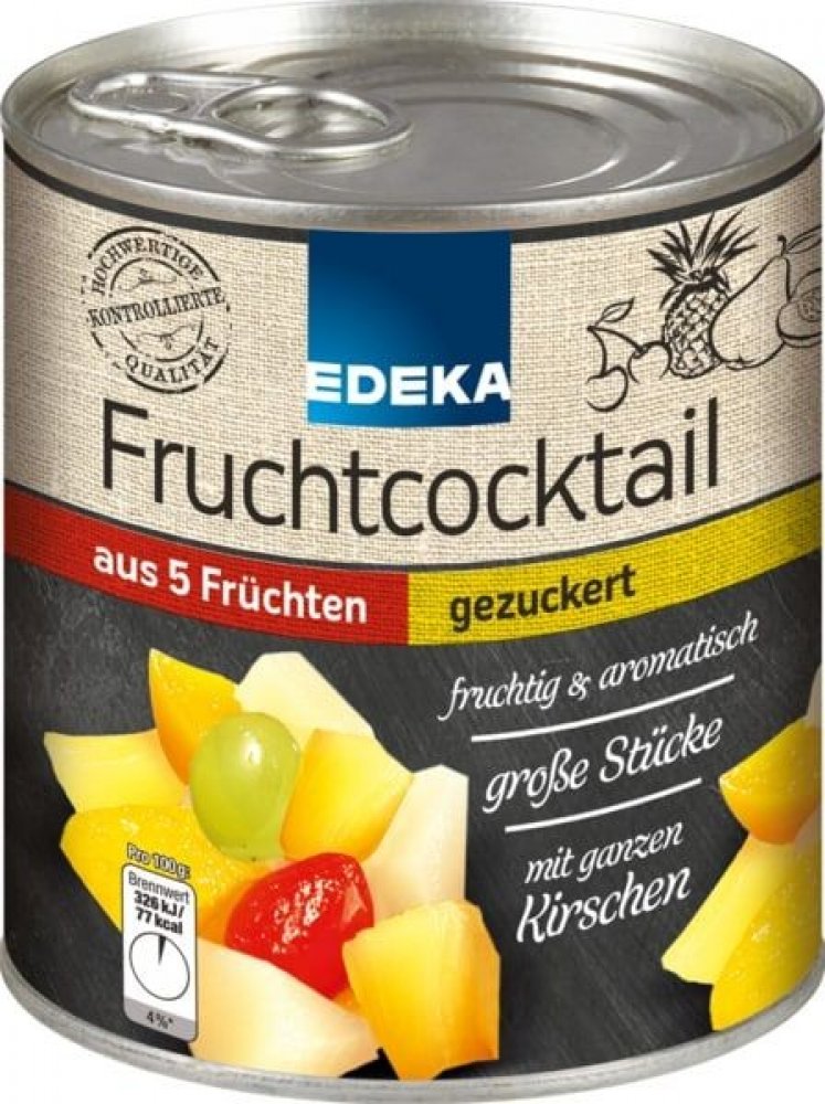 kandovanýMix broskev, hrušky, ananasu, hroznů a třešníobzvláště velkéseznam přísadSložení: 49 ovoce v proměnlivém poměru: broskve, hrušky;Voda, 12 ovoce v proměnlivých poměrech: ananas, hrozny, barevné třešně (třešně, barva: erythrosin), cukr, kyselost: kyselina citronová.nutriční informacePrůměrné nutriční hodnotykaždý 100 ml nebo gna podání RM na 100 ml nebo g nebo na porciVýhřevnost v kJ327.004Výhřevnost v kcal77,004Tuk v g0.10 1Tuky, z nichž nasycené mastné kyseliny v g0.00Sacharidy v g17.807Sacharidy včetně cukru v g16.4018Vaječné bílé v g0.40 1Sůl v g0,01 1 RM = referenční množství pro průměrnou dospělou osobu (8 400 kJ / 2 000 kcal)Výrobce:EDEKA ZENTRALE AG Co. KGNew-York-Ring 6D-22297 Hamburg