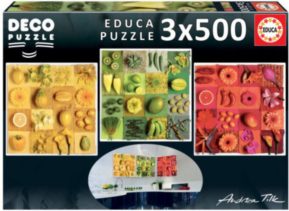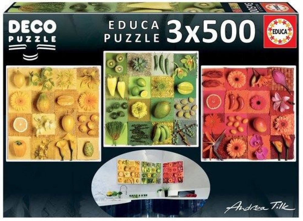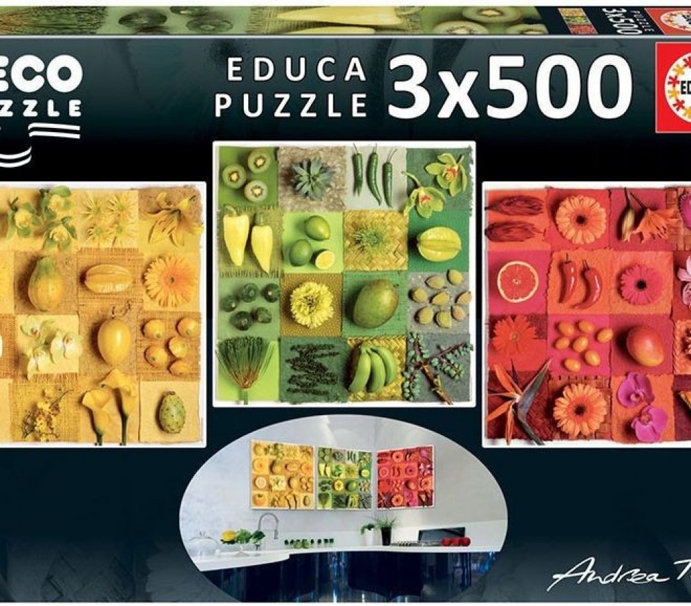 Puzzle a jeho skládání podporuje logické myšlení, a navíc pomáhá zkrátit volné chvíle. Jde o nestárnoucí klasiku, která baví jak děti, tak dospělé. V balení vás čeká 500 dílků, jejichž skládání bude výzvou pro trpělivější hráče. Nabízené puzzle motivuje k jeho složení poutavým výsledným obrázkem.. Pro jeho výrobu byl zvolen materiál, kterým je papír. Zásadní vlastnosti puzzle Čtvercové puzzle Exotické ovoce a květiny 3x500 dílků Puzzle pomáhá procvičit koncentraci, jemnou motoriku i představivost Jeho skládání navíc přispívá k relaxaci Zajímavé puzzle Educa je svým motivem ideální pro děti od 14 let Téma: jídlo a pití Puzzle obsahuje celkem 500 dílků Spadá mezi klasické puzzle, které všichni dobře známe K jeho výrobě slouží papír