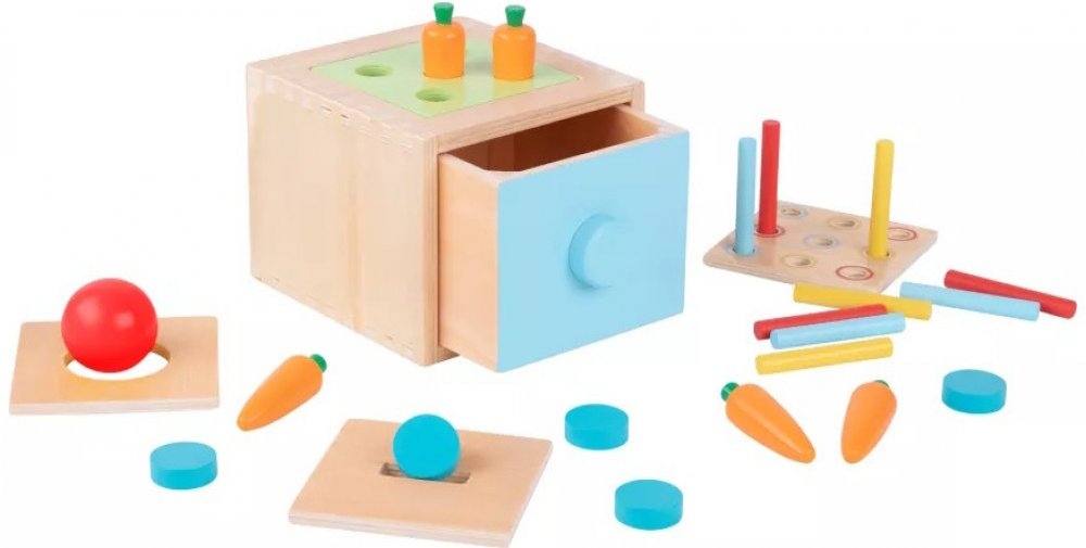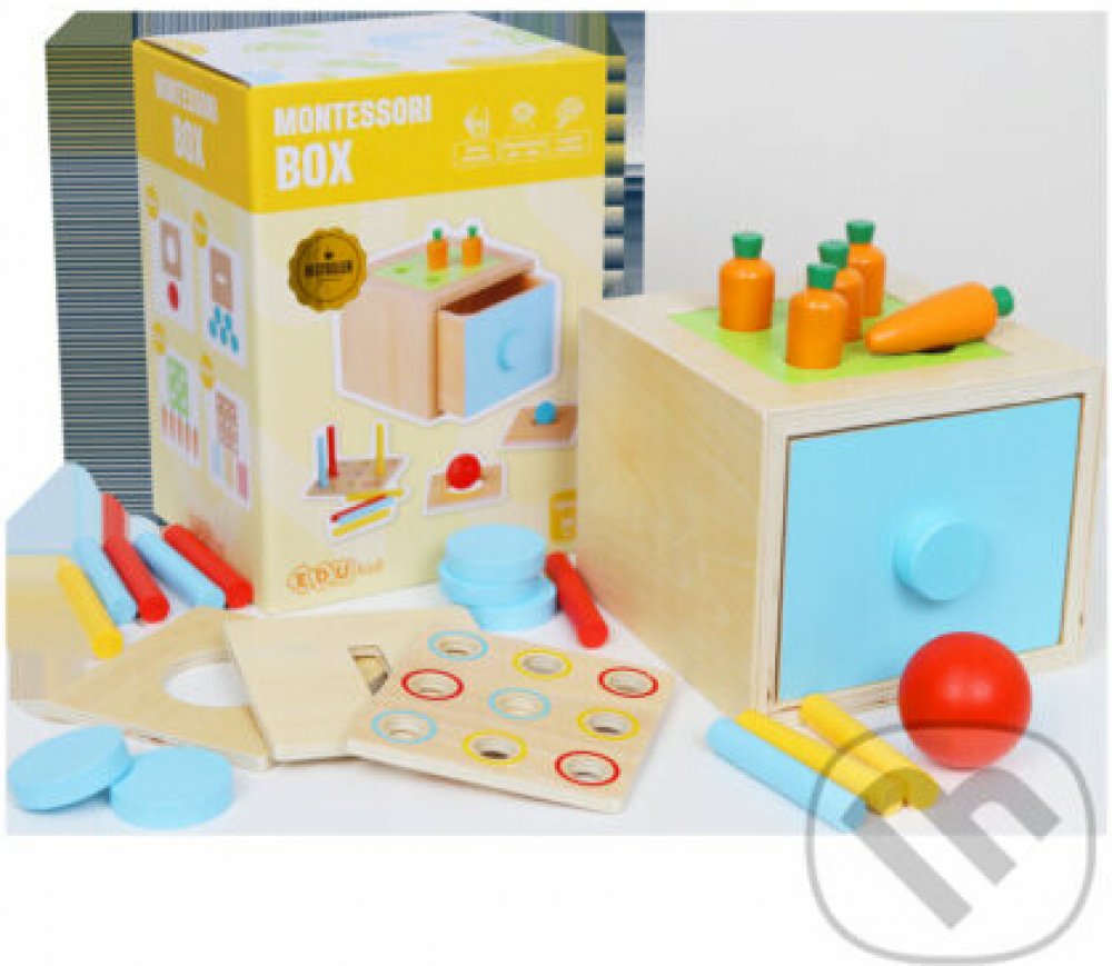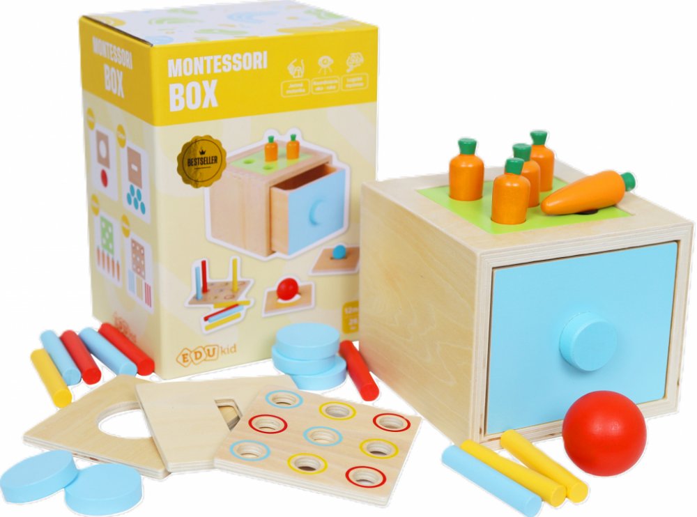 Montessori box 4v1 Nejlepší multifunkční hračka pro rozvoj dětí Montessori hračky jsou proslulé svým přístupem k podpoře přirozeného vývoje dítěte prostřednictvím učení hrou. Montessori box je originální multifunkční hračka, která nabízí čtyři různá využití podle aktuální vývojové fáze dítěte. Dřevěná krabička se zásuvkou má odnímatelnou horní část, která umožňuje dětem měnit aktuální hru. Jaké typy vložek najdete v Montessori boxu?1) Vkládání míče - vhodné pro děti od 12 měsíců.2) Vkládání mincí - vhodné pro děti od 12 měsíců3) Vkládání mrkví - vhodné pro děti od 15 měsíců4) Vkládání barevných tyčinek - vhodné pro děti od 24 měsíců - dítě se nejprve naučí trefit tyčinkou do některého z otvorů. Později můžete hru ztížit a dítě se musí trefit do stejného barevného otvoru jako palička.Všestranná Montessori hračka roste s dítětem Montessori box podporuje rozvoj dětí v několika oblastech. Při hře si děti zlepšují jemnou motoriku, koordinaci ruka-oko a učí se rozpoznávat barvy a tvary, což rozvíjí i jejich logické myšlení. Učení hrou jim dává možnost zažít úspěch s každým správně umístěným předmětem, což zvyšuje jejich sebevědomí. Tato vkládačka 4v1 také umožňuje dětem rozvíjet třídění a rozpoznávání tvarů, což jsou důležité kroky v jejich intelektuálním rozvoji.