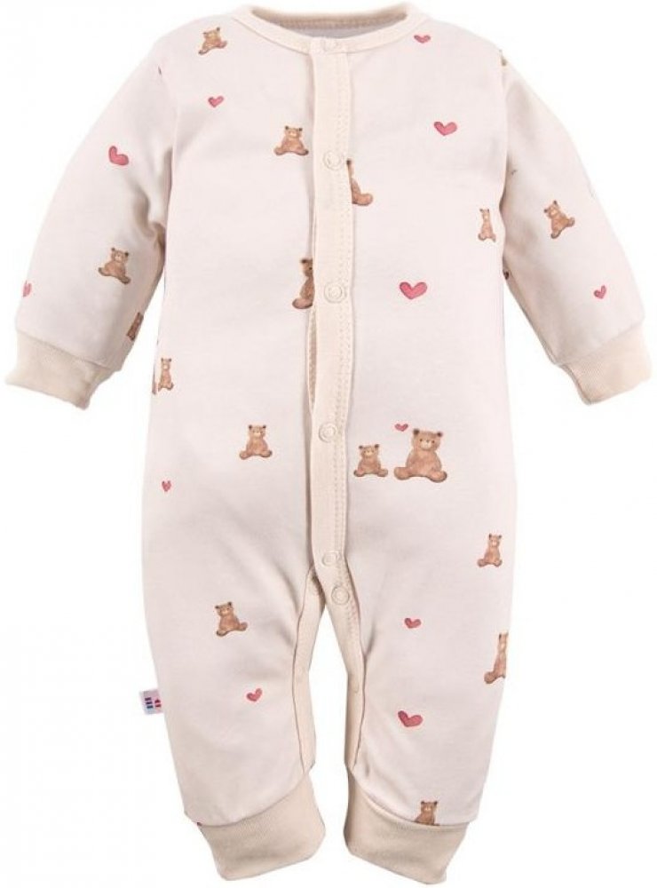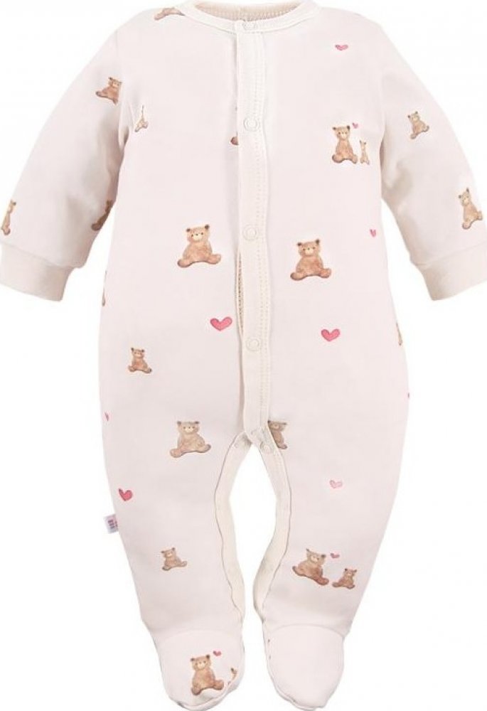 Kojenecký overal z kolekce Hearts&Bears značky Eevi - design MEDVÍDCI. Barevná kombinace: světle růžová/krémová. Celovzorovaný - s obrázky malých medvídků a srdíček - digitální tisk. Celorozepínací - v těle a mezi nožičkama na patentky. Materiál: 100% bavlna (jersey úplet). Vyrobeno v EU.