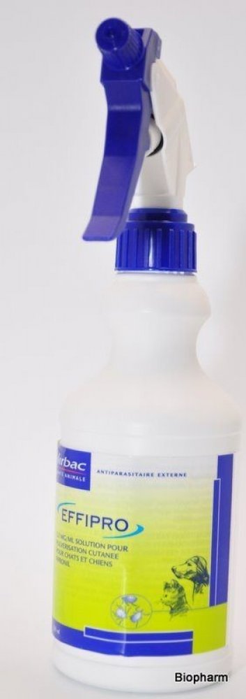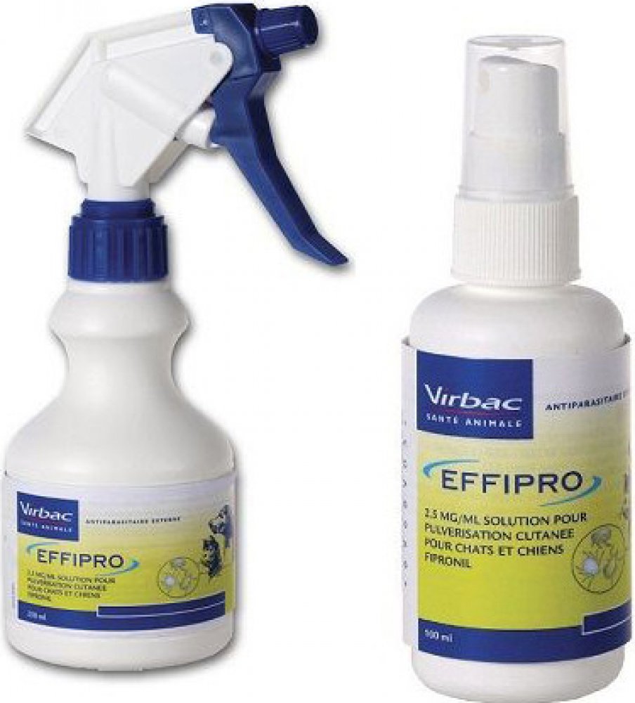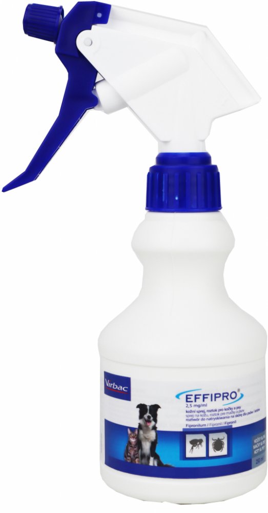 Effipro sprej je antiparazitikum pro léčbu a prevenci napadení blechami, klíšťaty a všenkami a pro léčbu a kontrolu alergie na bleší kousnutí (FAD) u psů a koček.