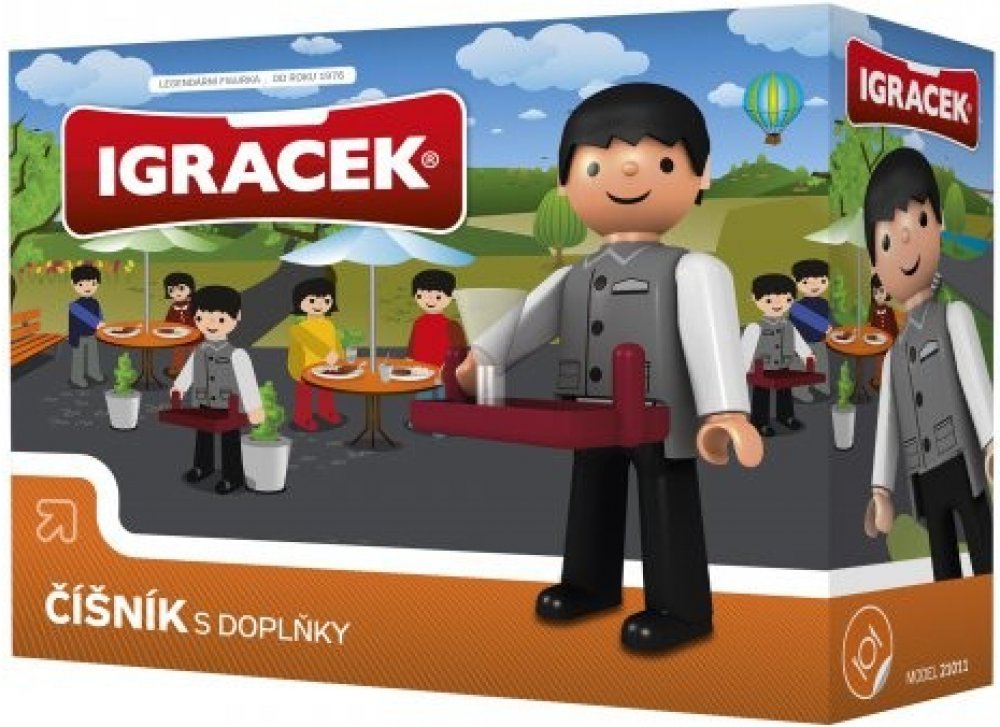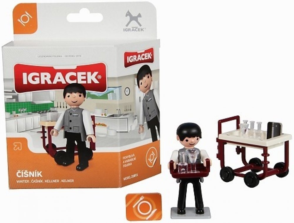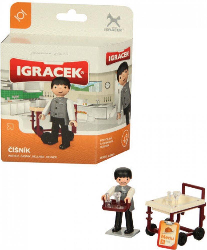 Vaše menu, prosím. Dnes servírujeme jen ověřené dobroty. Igráček číšník + doplňky. Vyrobeno v ČR.