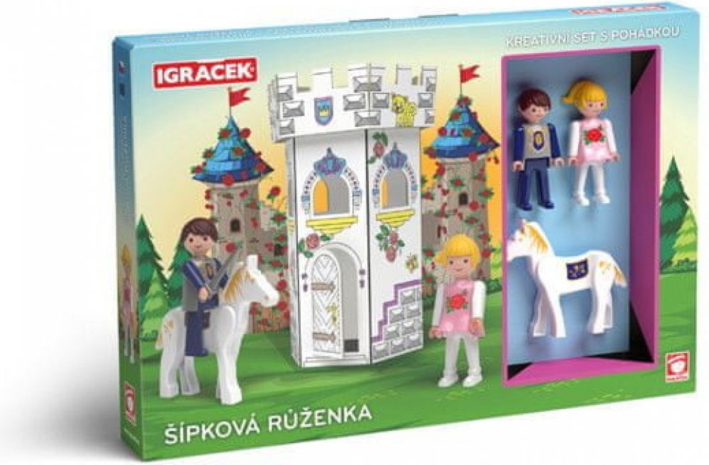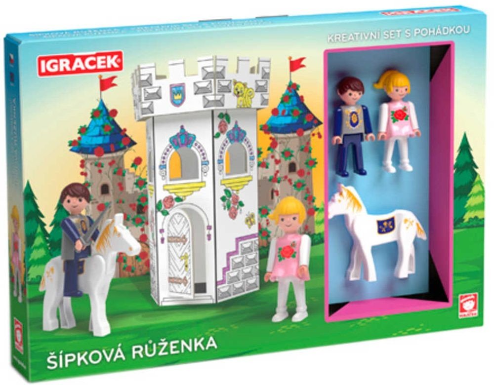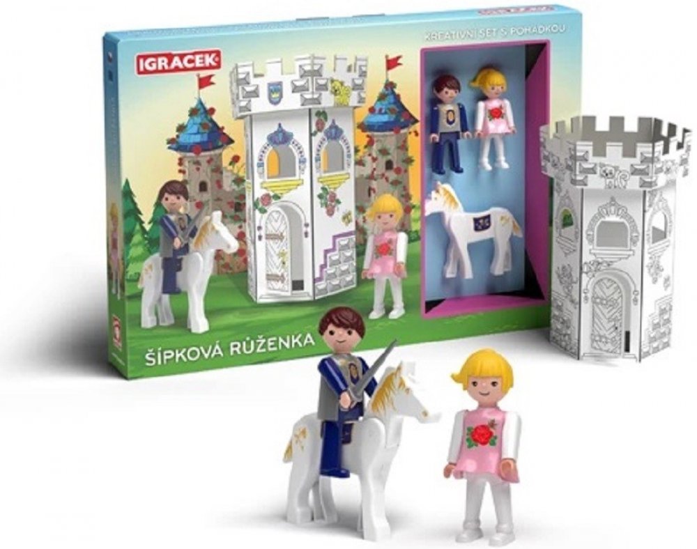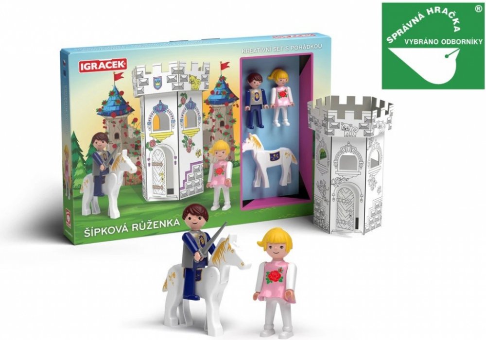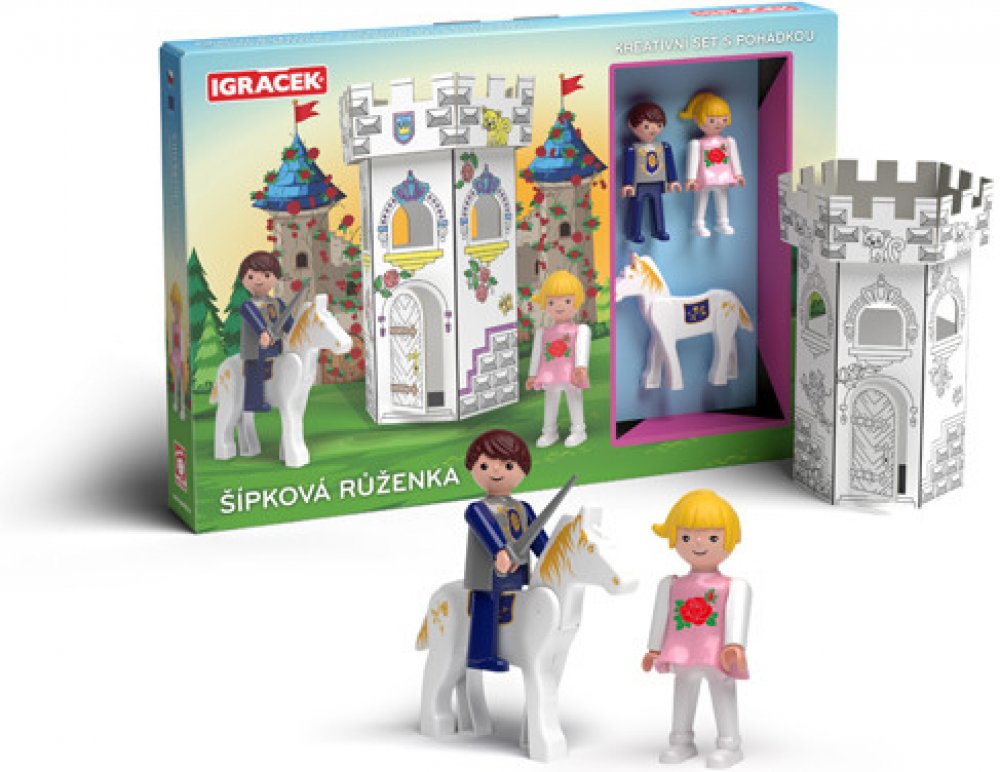 Vymaluj, sestav a hraj si! Kreativní set Igráčků s kartonovou skládací zámeckou věží s předtištěnými motivy k vymalování podporuje zručnost a fantazii dětí. Set obsahuje i dvě postavičky Igráčků Růženky a Prince s