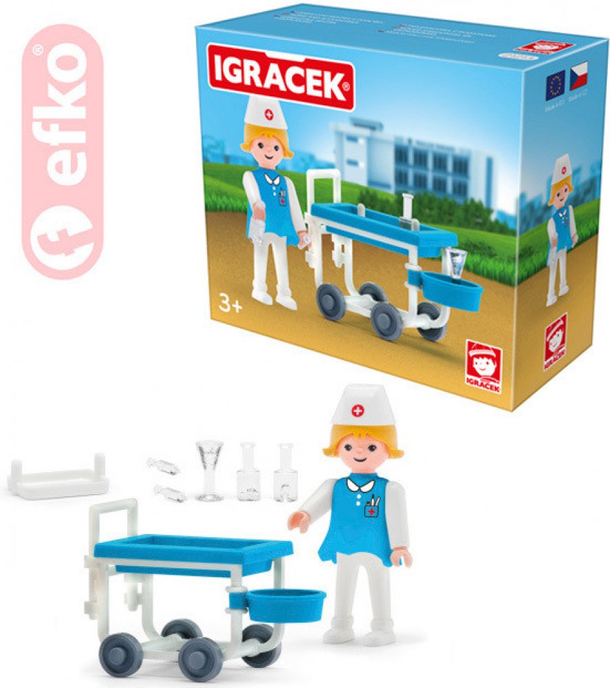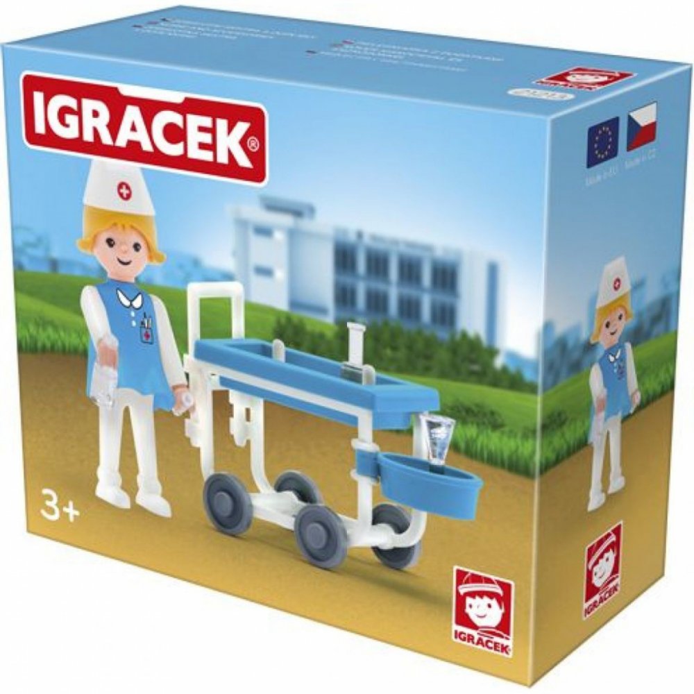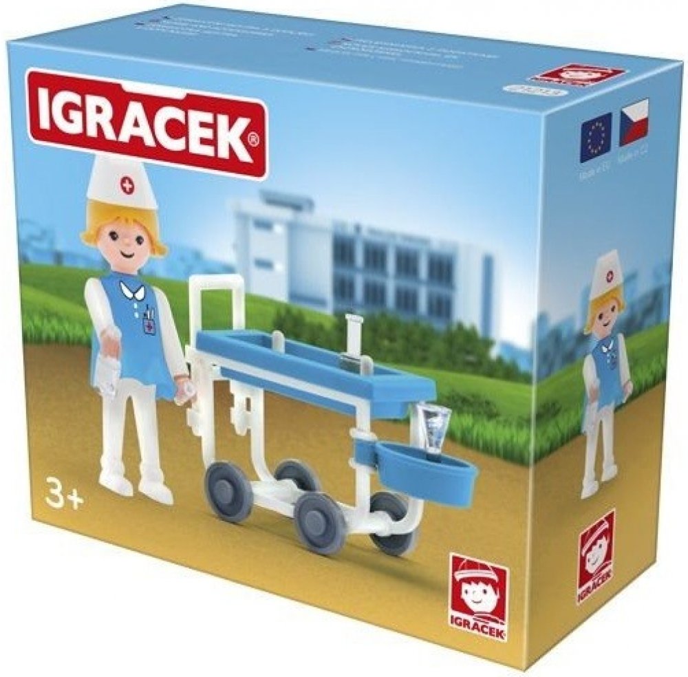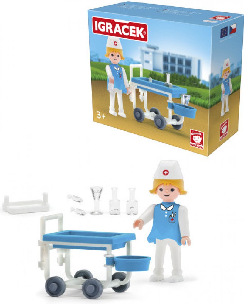 Pomáhej ostatním nemocným Igráčkům. Obětavá sestřička s vozíkem plným léků pomůže ulevit od všech možných bolístek. Hračka rozvíjí jemnou motoriku a fantazii dětí. Legendární postavička od roku 1976. Vyrobeno v České republice.