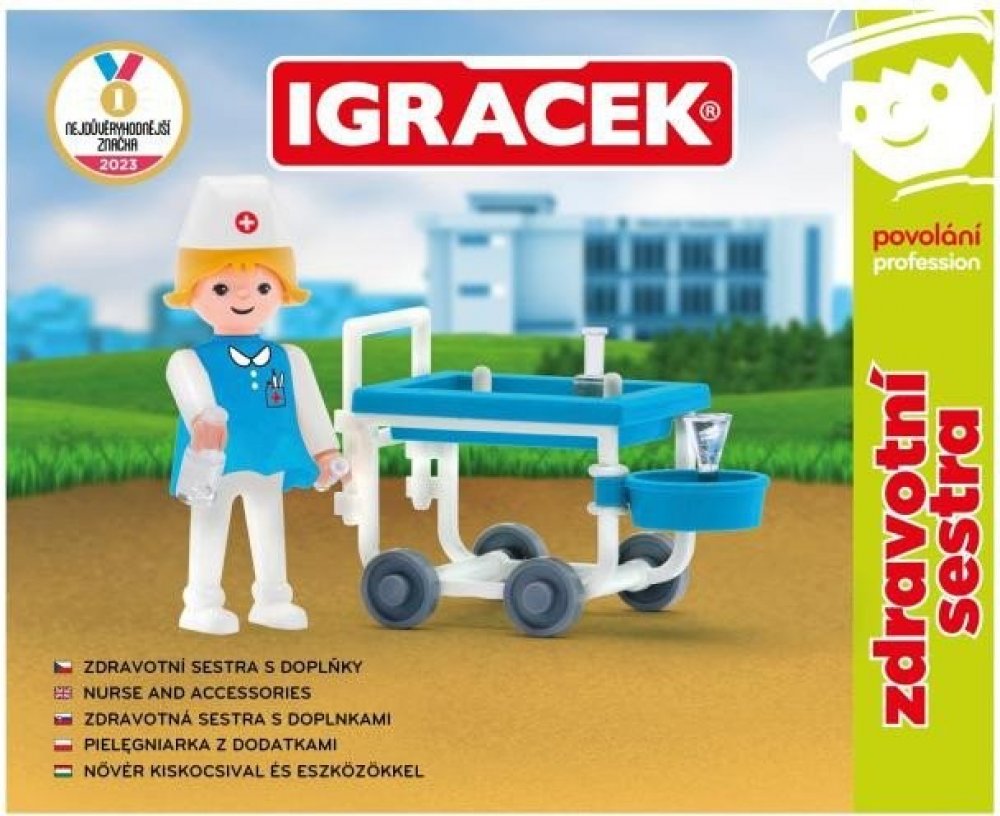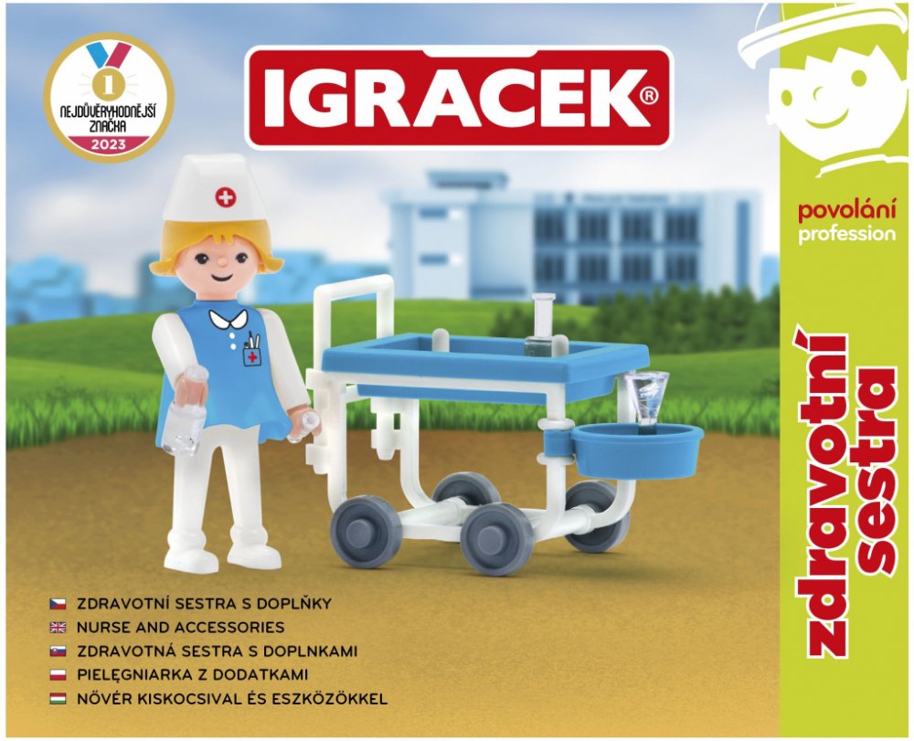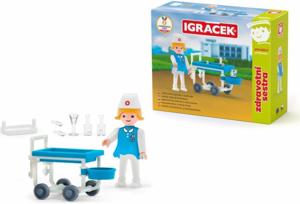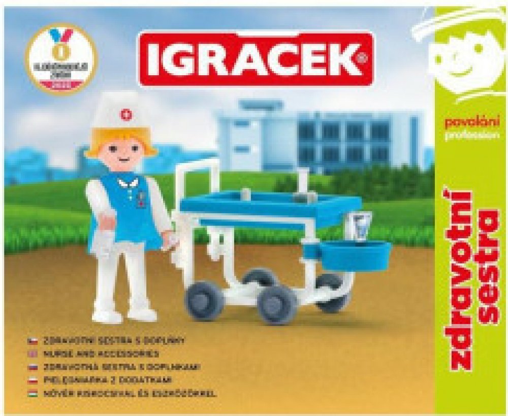 Pomáhej ostatním nemocným Igráčkům. Obětavá sestřička s vozíkem plným léků pomůže ulevit od všech možných bolístek. Hračka rozvíjí jemnou motoriku a fantazii dětí. Legendární postavička od roku 1976. Vyrobeno v České republice.