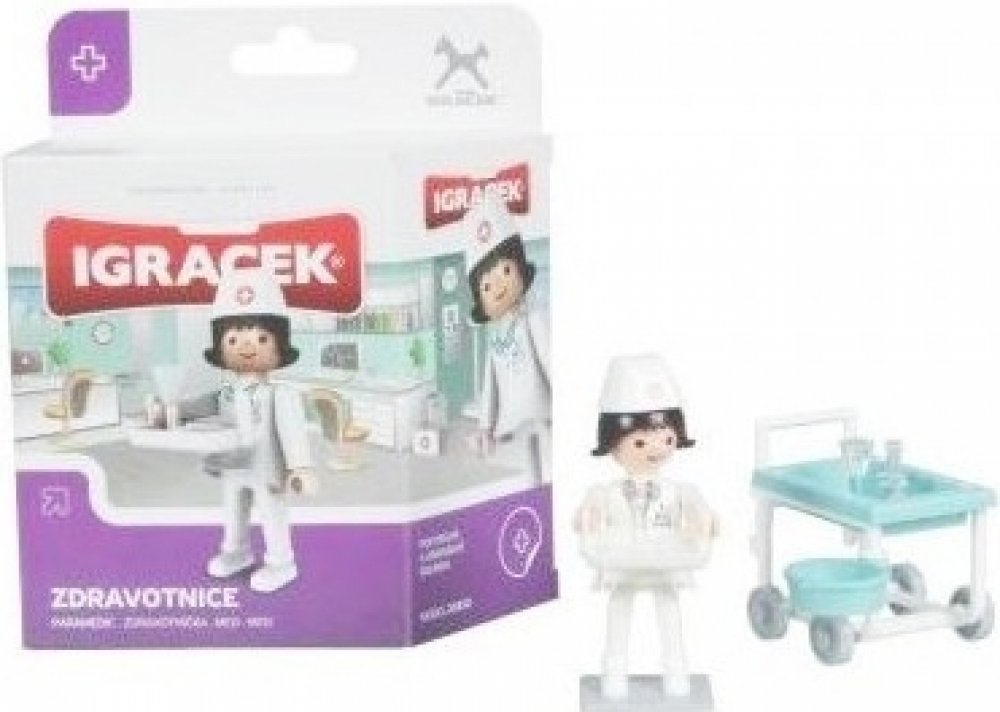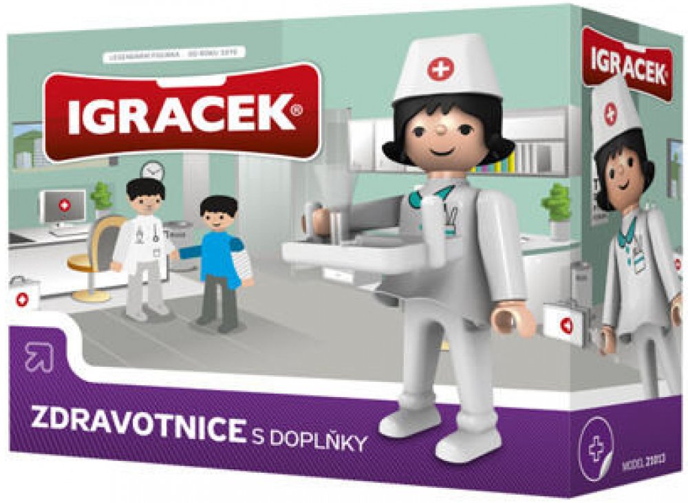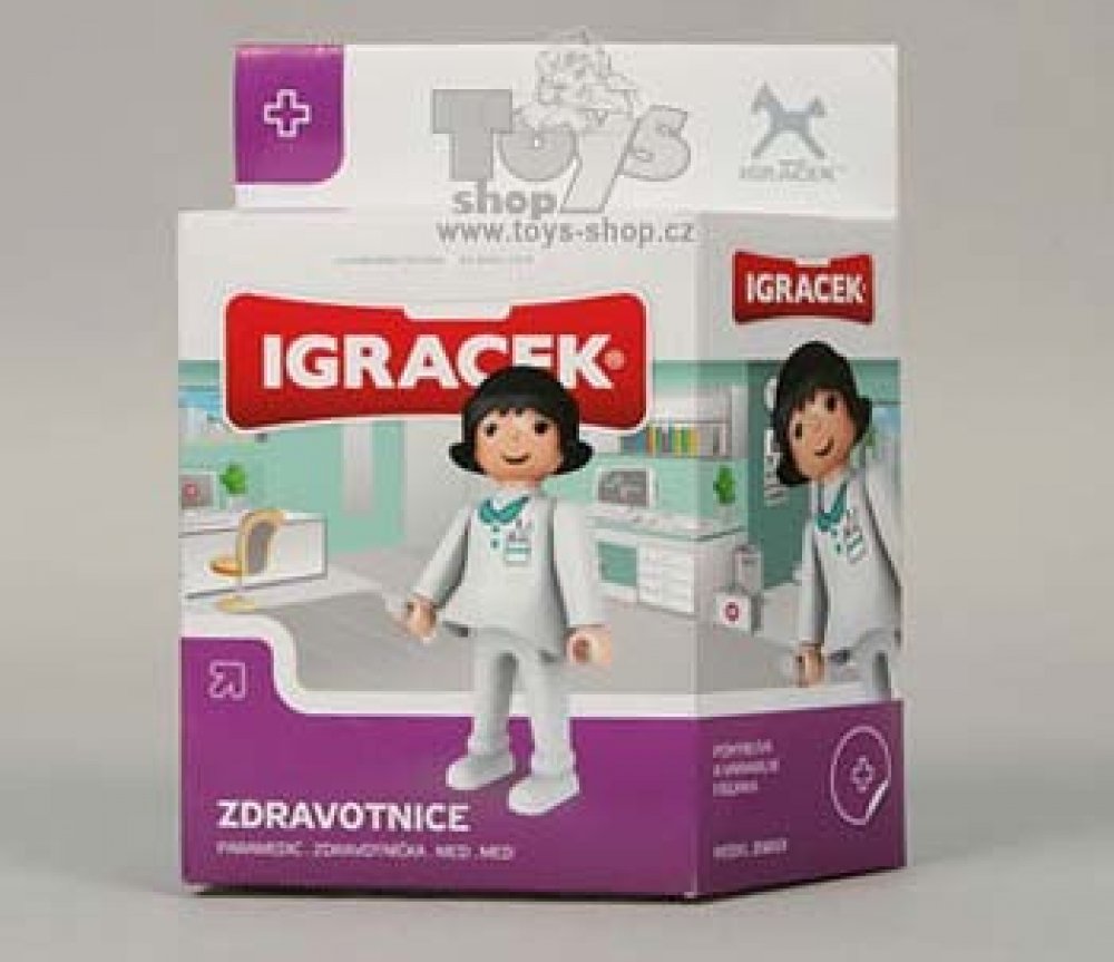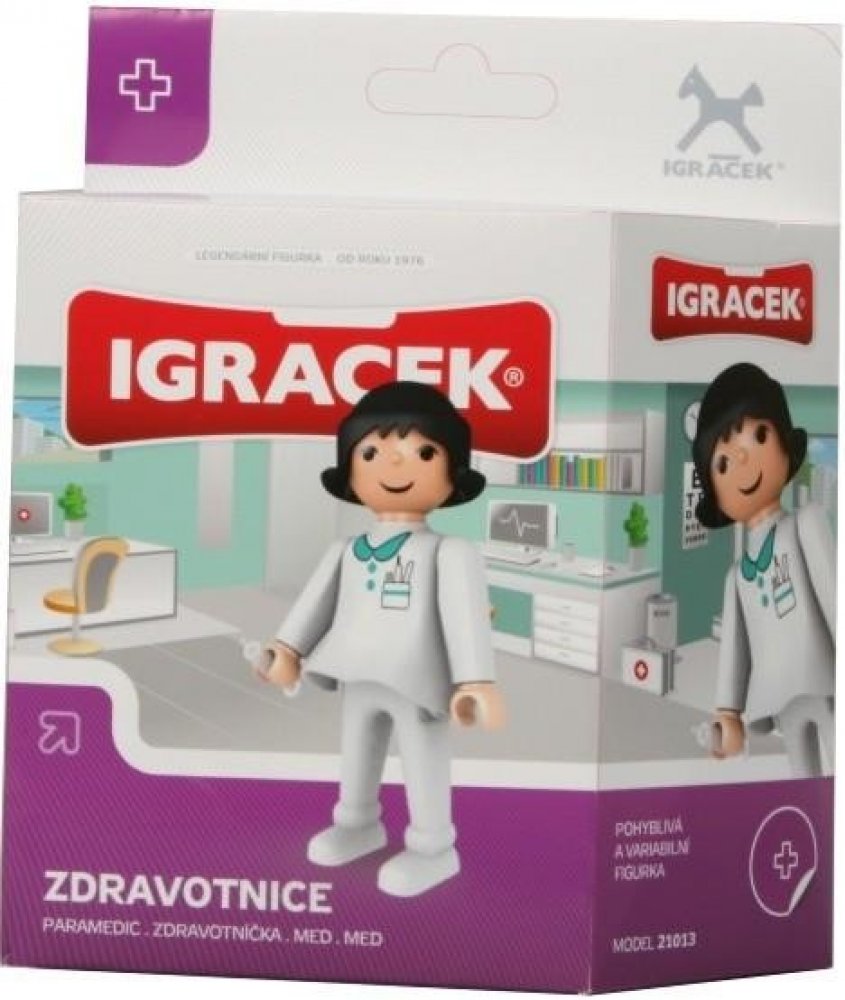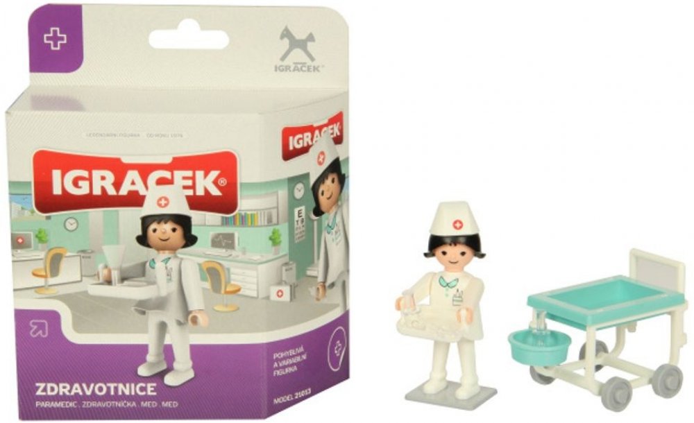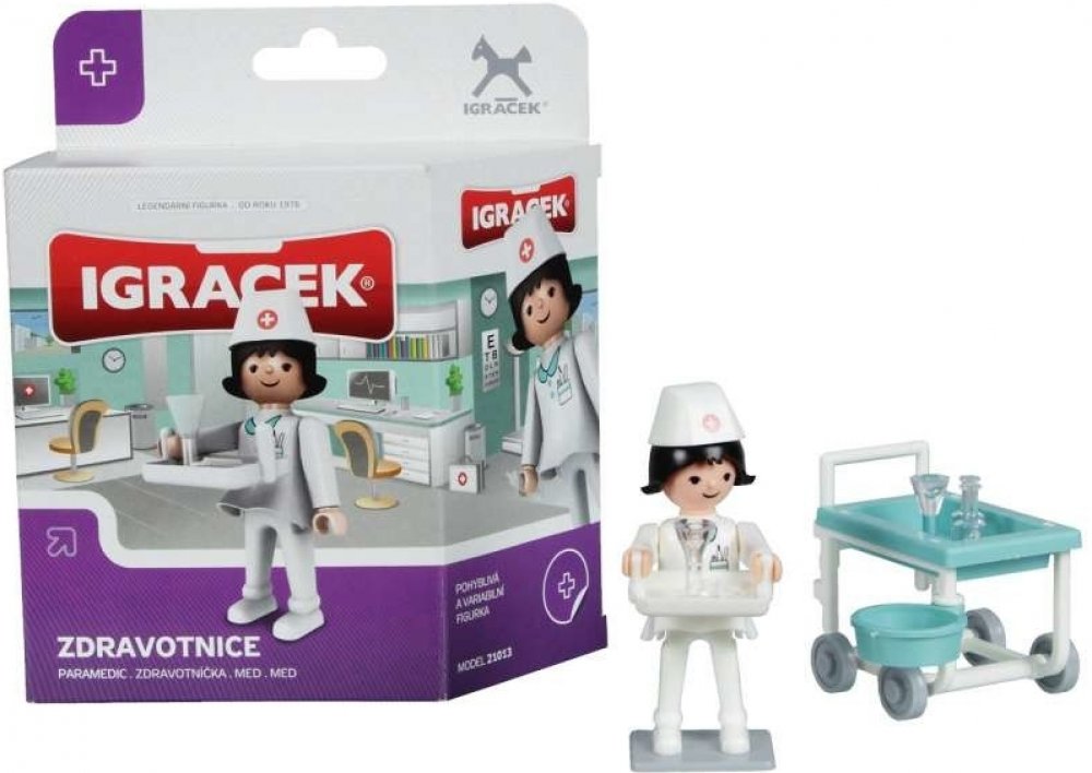IGRÁČEK - Zdravotnice midi. Igráček je plastová figurka s doplňky a pohyblivými částmi těla jako je hlava, ruce a nohy. Igráček měří 76 mm. Tato figurka Vám představuje povolání zdravotnice. Balení obsahuje postavičku Igráčka zdravotnice, tác s lékařskými potřebami a další potřebné vybavení pro zdravotnici. Hračka je český výrobek značky Efko a je vyrobena z materiálu, který odpovídá normě EN-71. ...