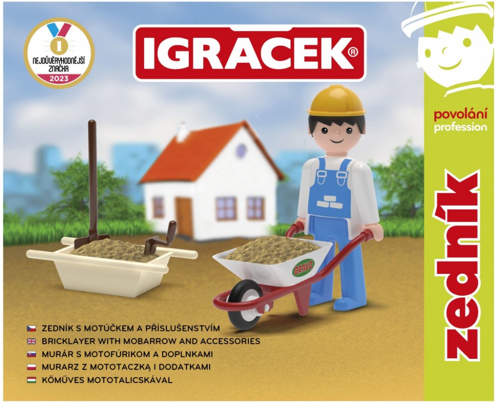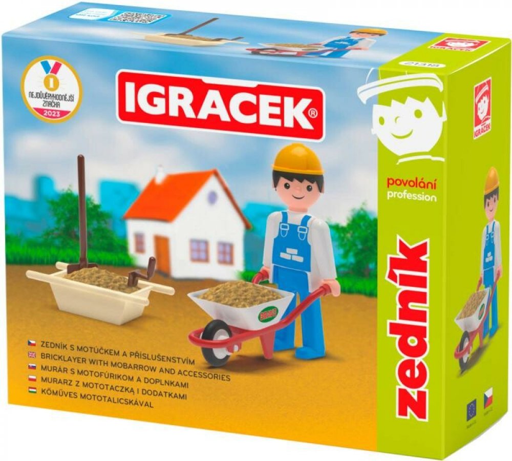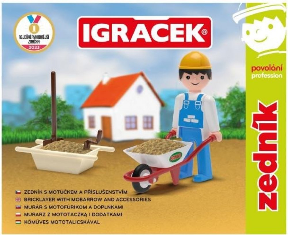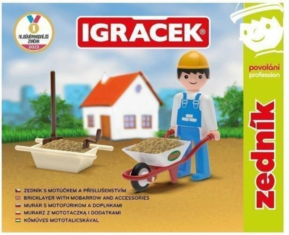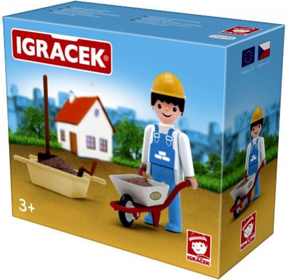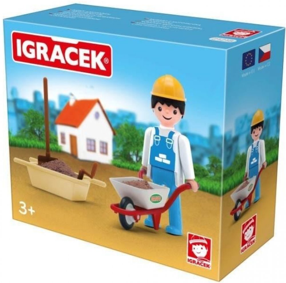 S pomocí Igráčka zedníka ti půjde stavba nového domu jedna radost. Společnými silami položíte základy, postavíte stěny a nakonec pokladete střechu. Panáček má spoustu doplňků, mezi nimi například zednickou lžíci, lopatu, vaničku na beton nebo kolečka.