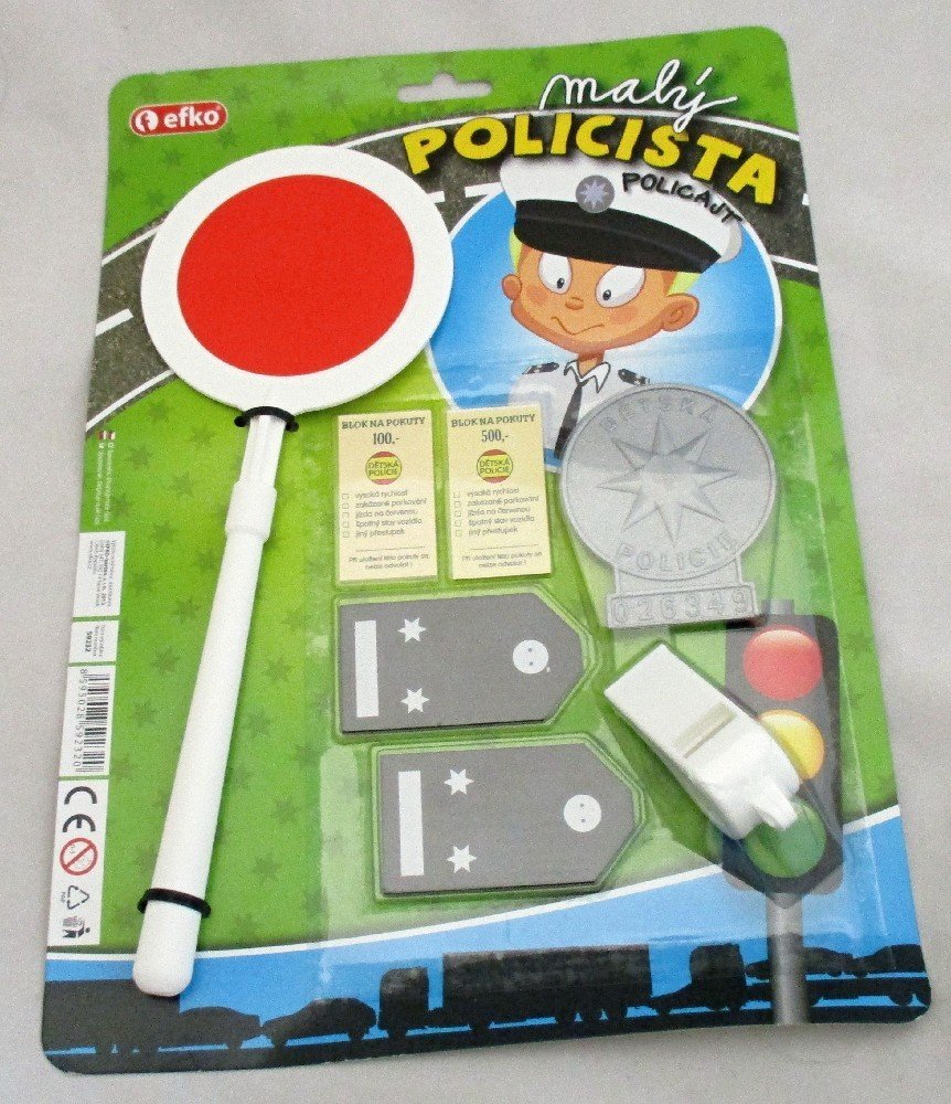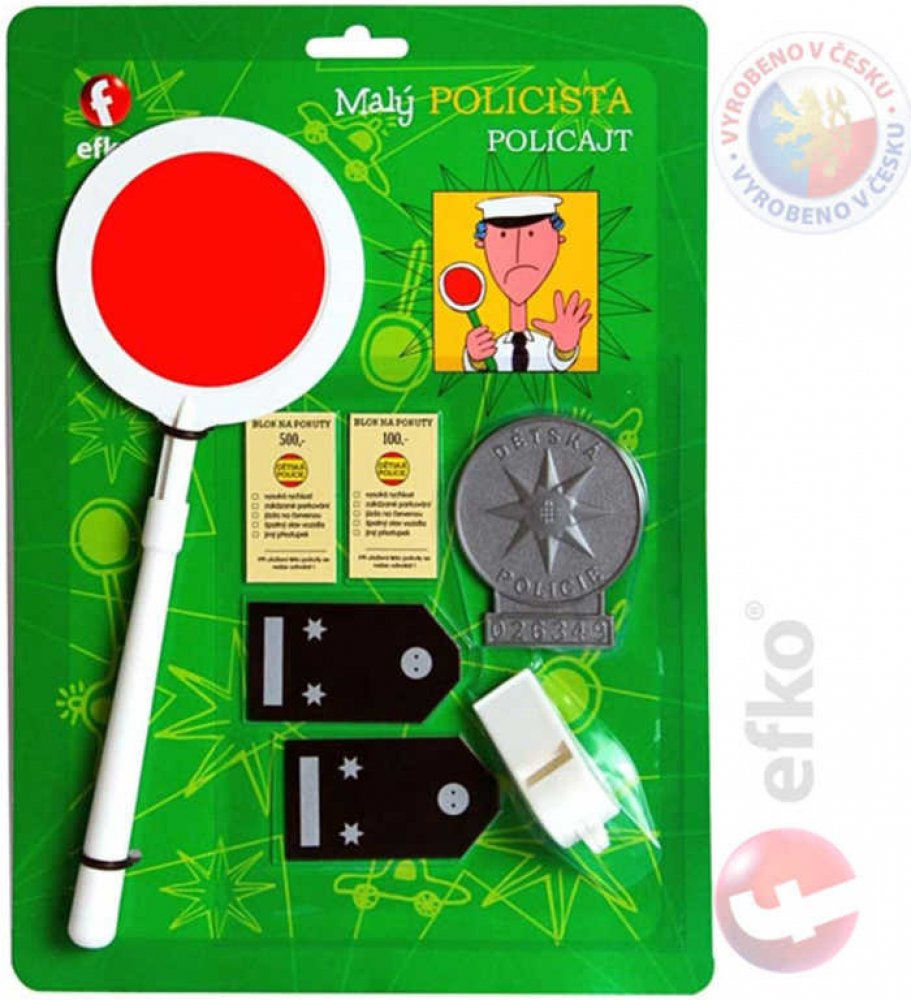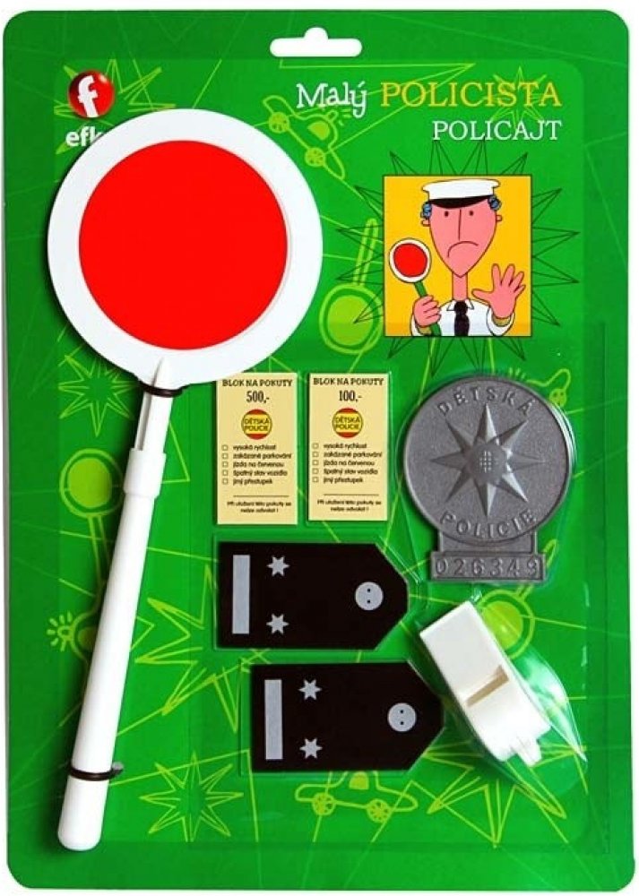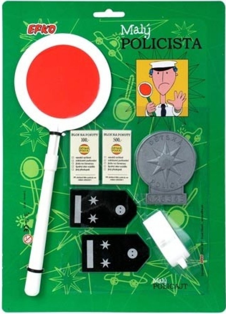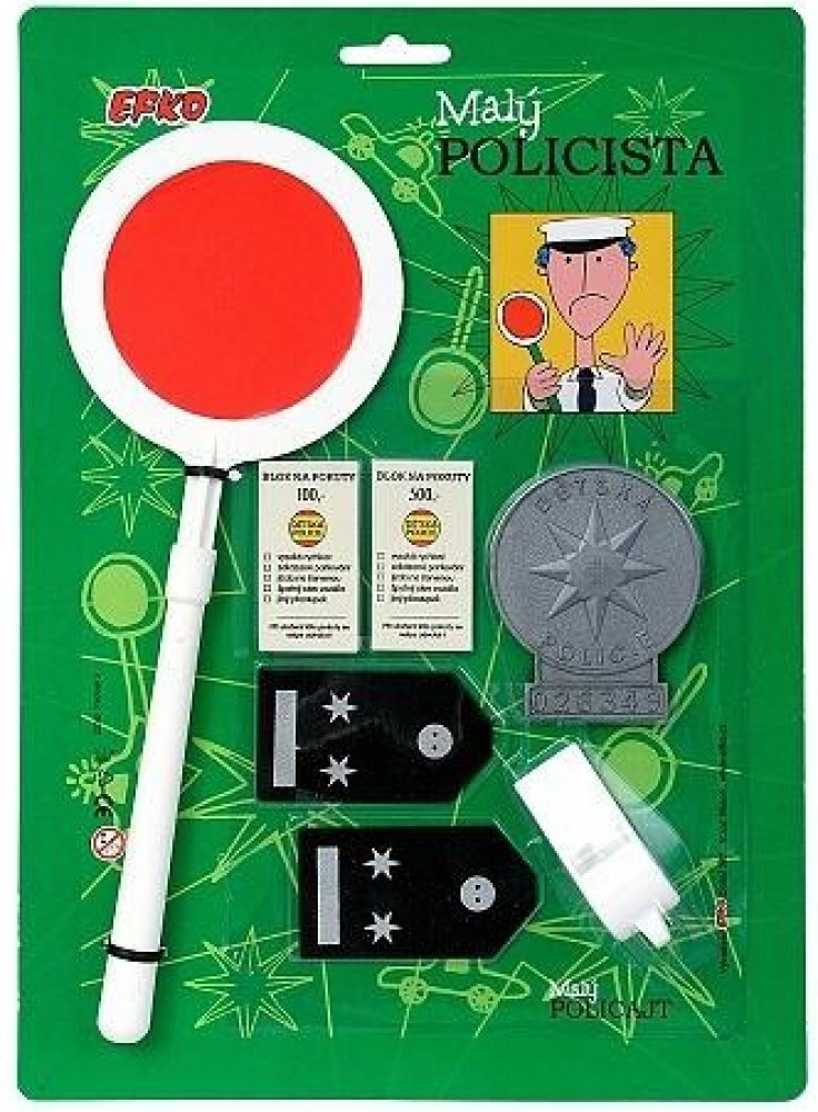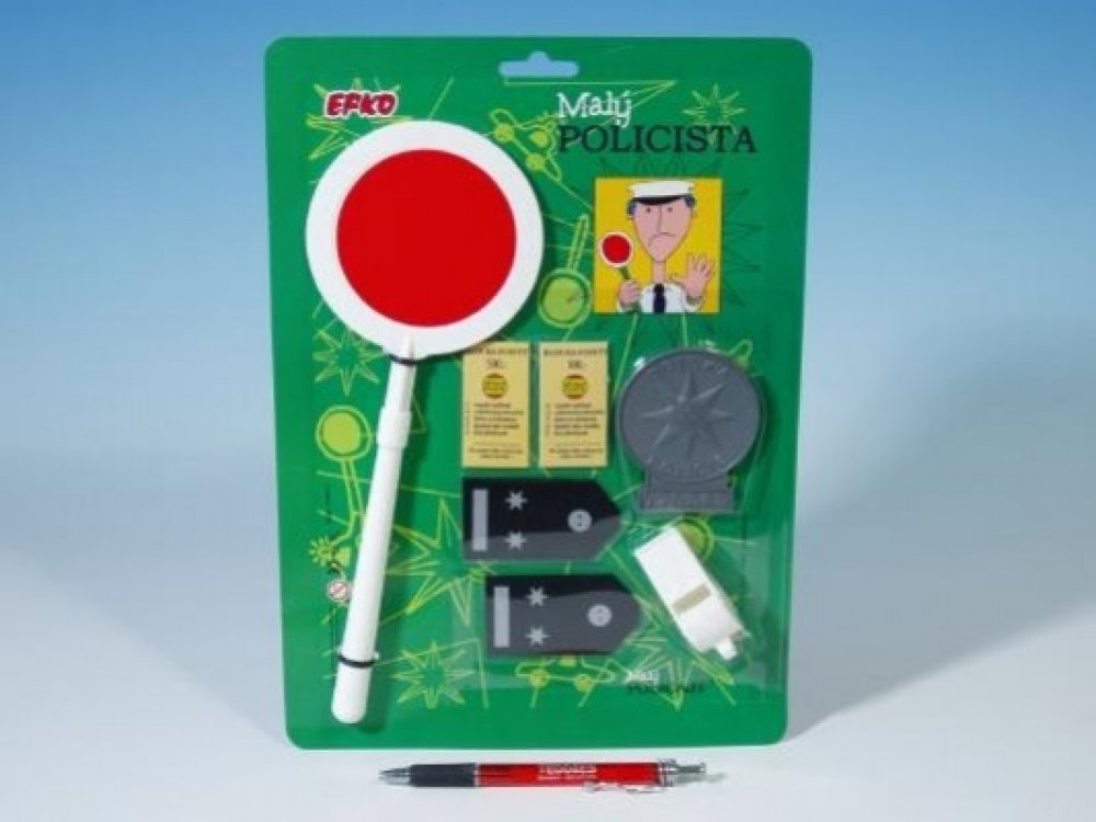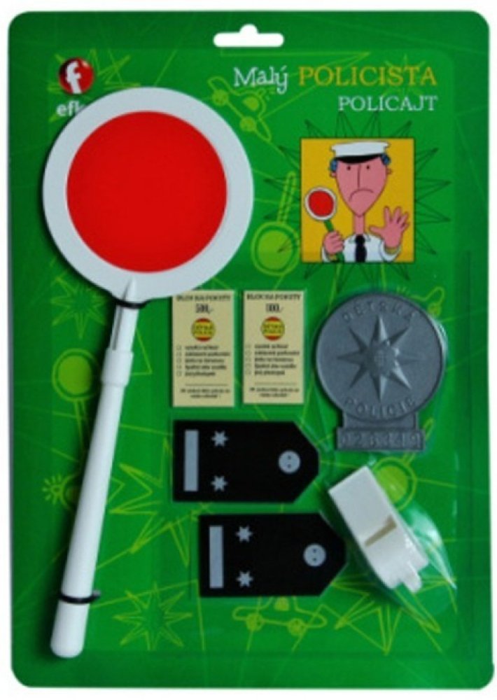 Nezaměnitelný odznak a typická plácačka prozrazují, že je na blízku běžná policejní kontrola. Hra Malý policista obsahuje plácačku, pokutové bločky, policejní odznak, výložky a píšťalku.