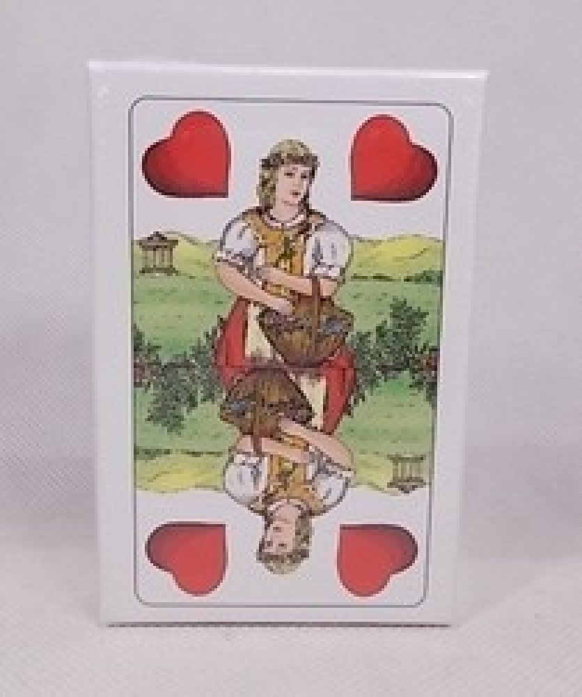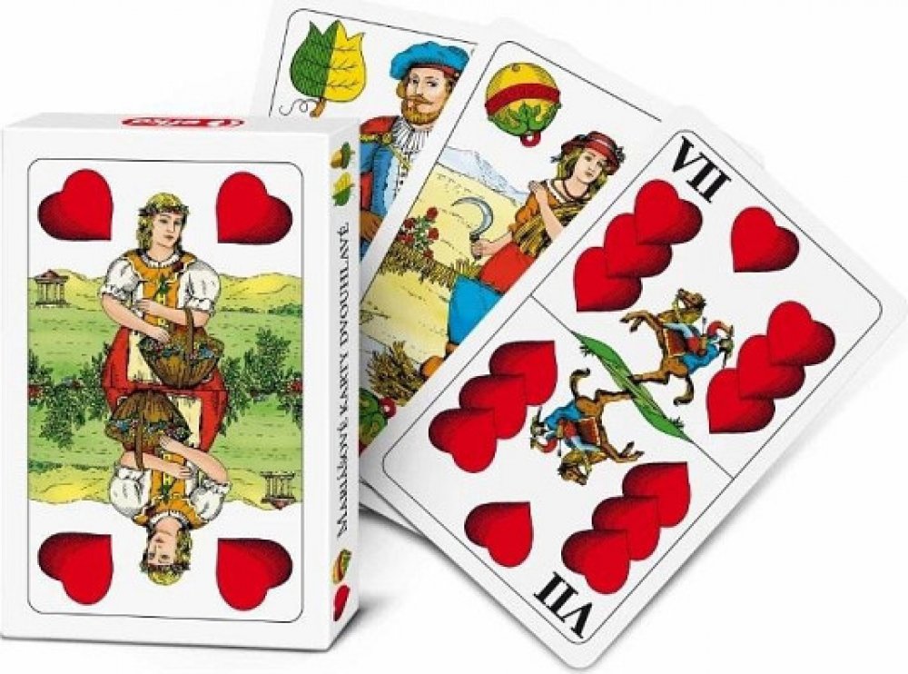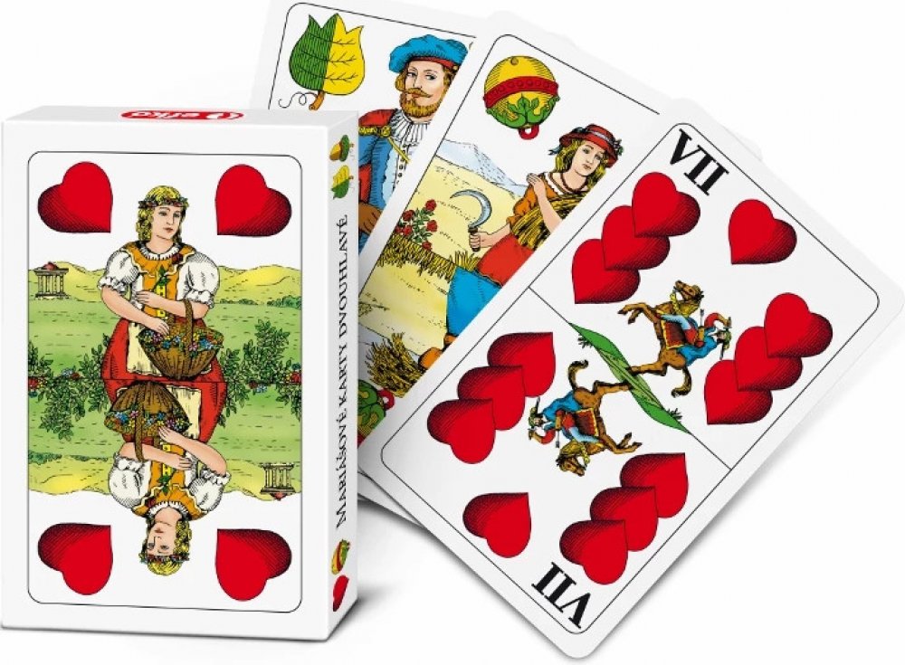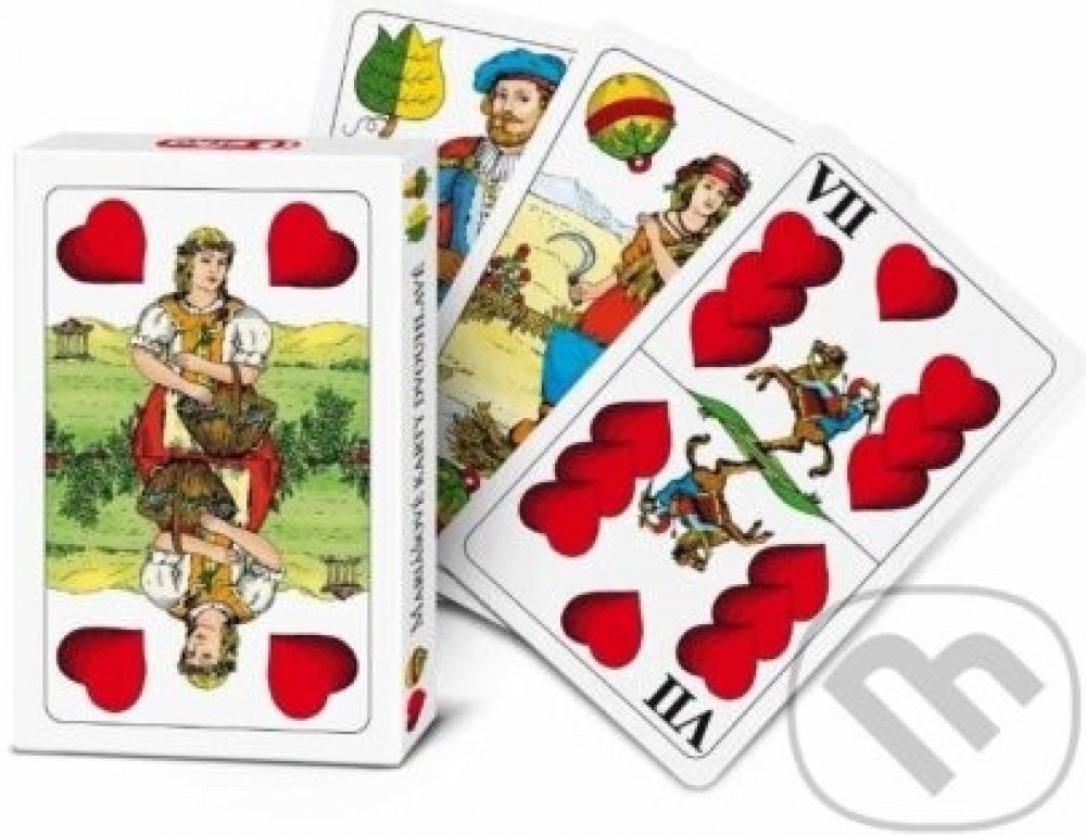 Klasické dvouhlavé karty z kvalitního karetního papíru, se kterými si zahrajete nespočet známých her. Klasické dvouhlavé karty z kvalitního karetního papíru, se kterými si zahrajete nespočet známých her - Mariáš, Válku, Prší... Zabaleno v pevné kartonové krabičce víko/dno. Vyrobeno v České republice. Obsahuje 32 karet. Rozměr balení: 11 x 7,5 x 2 cm.