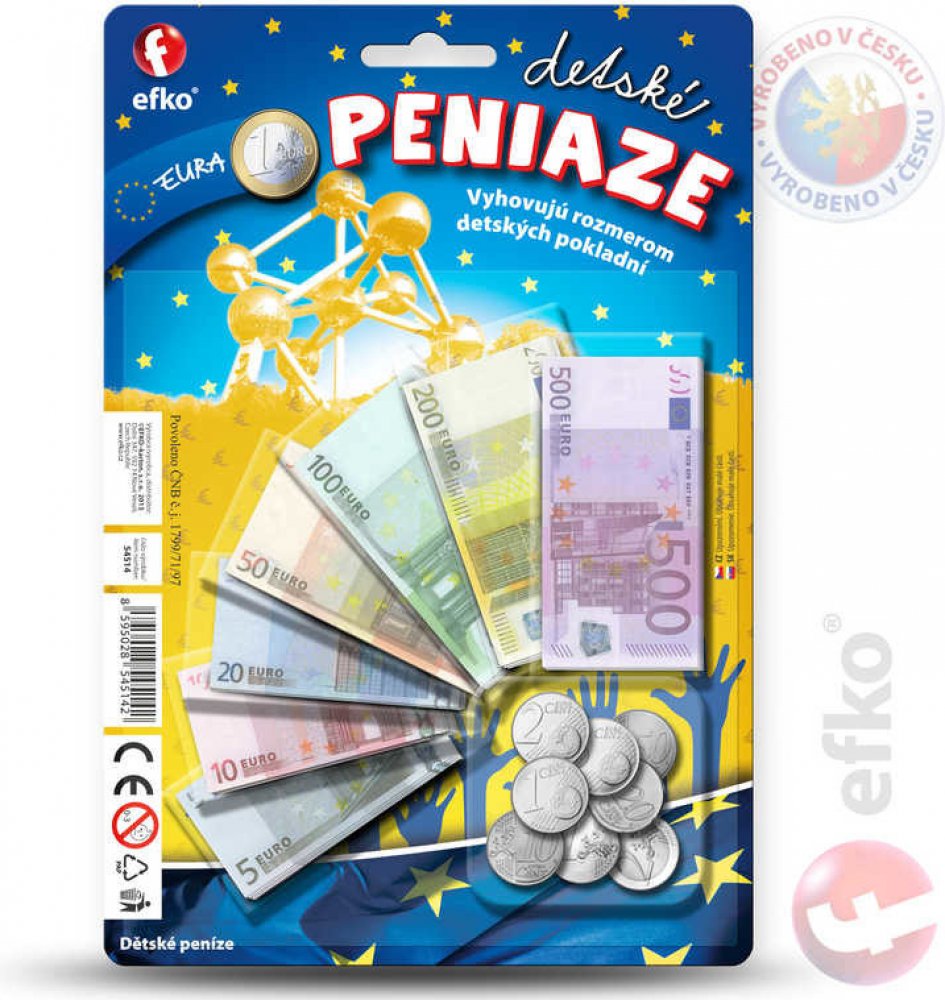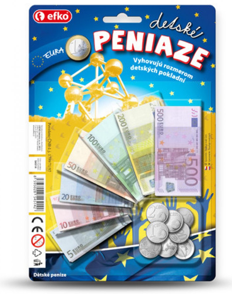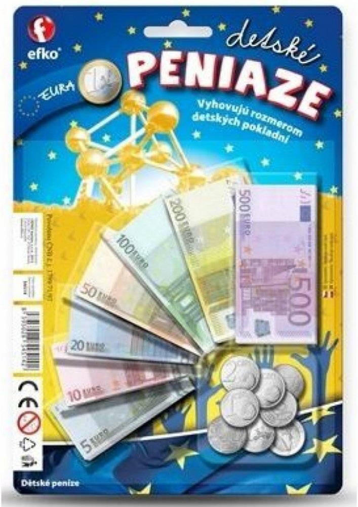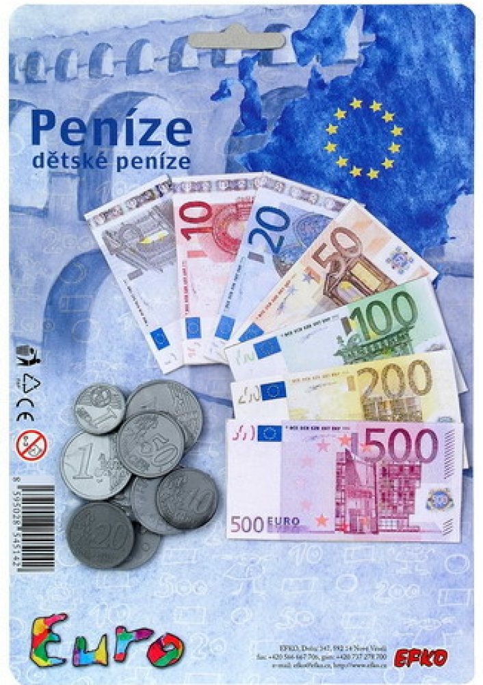 Seznam se s penězi, kterými se platí v zemích Eurozóny! Vyhovují rozměru dětských pokladen. Dětské peníze jsou kopií těch pravých. Balení obsahuje: 1 x 1 cent, 1 x 2 centy, 1 x 5 centů, 1 x 10 centů, 1 x 20 centů, 1 x 50 centů, 1 x 1 1 x 2 Eura a papírové bankovky (7 druhů). EURA. Umíš je spočítat? Dětské peníze jsou kopií peněz pravých a můžeš je použít u mnoha dalších her. Didaktická pomůcka a zároveň hračka. Naučíš se poznávat druhy bankovek a naučíš se počítat. ČR.\n EFKO Kindergeld -