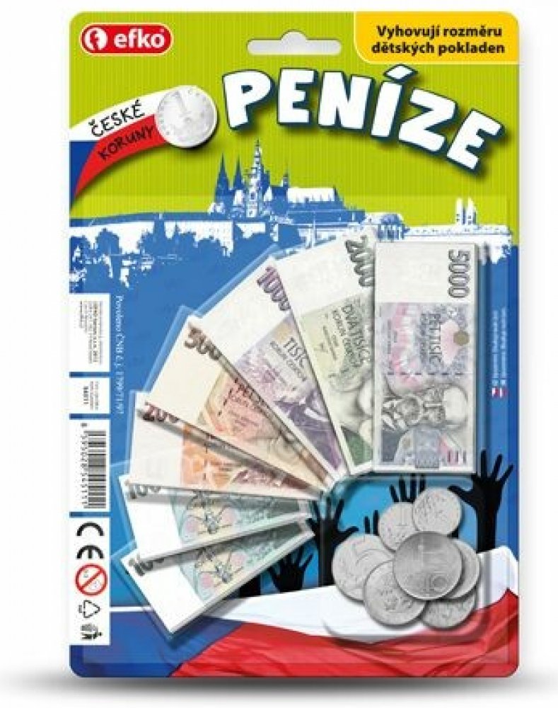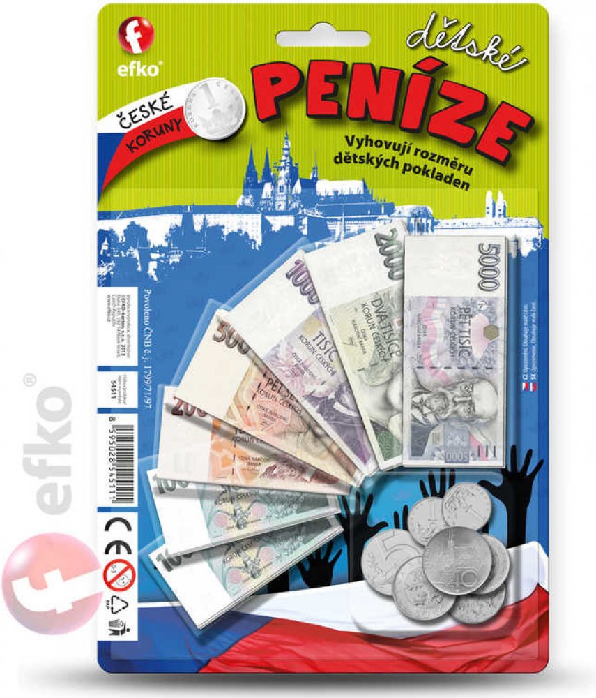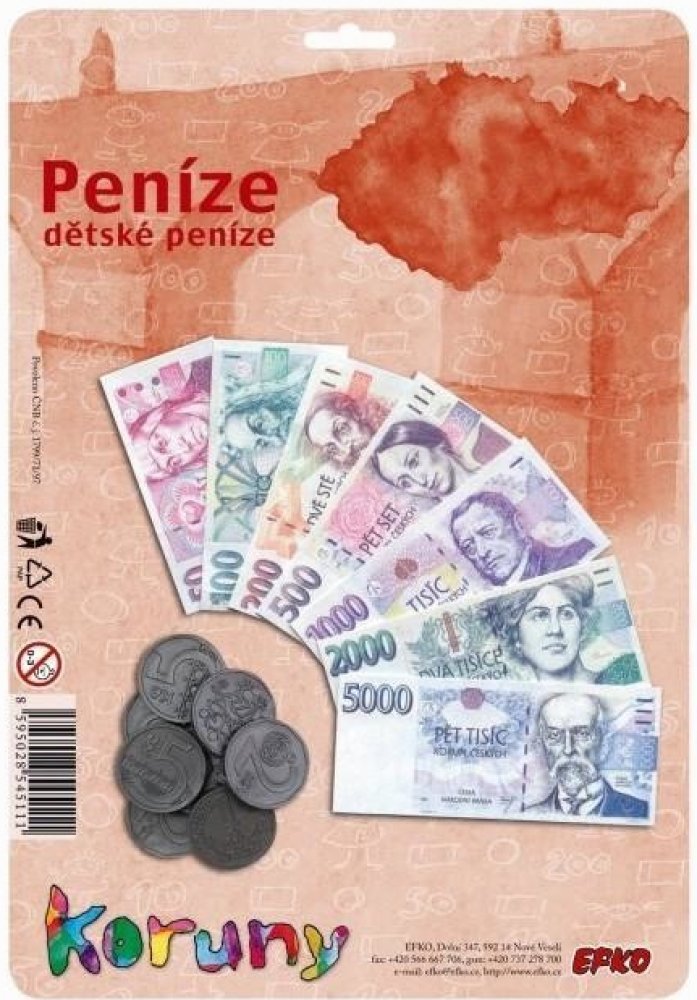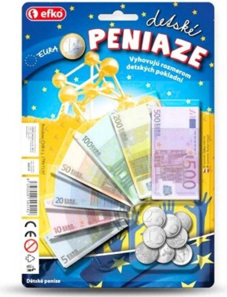 Seznam se s penězi, kterými se platí v zemích Eurozóny! Vyhovují rozměru dětských pokladen. Dětské peníze jsou kopií těch pravých. Balení obsahuje: 1 x 1 cent, 1 x 2 centy, 1 x 5 centů, 1 x 10 centů, 1 x 20 centů, 1 x 50 centů, 1 x 1 1 x 2 Eura a papírové bankovky (7 druhů). EURA. Umíš je spočítat? Dětské peníze jsou kopií peněz pravých a můžeš je použít u mnoha dalších her. Didaktická pomůcka a zároveň hračka. Naučíš se poznávat druhy bankovek a naučíš se počítat. ČR.\n EFKO Kindergeld -
