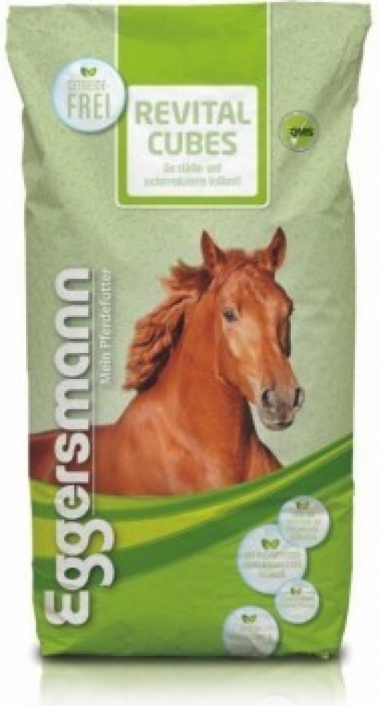 EGGERSMANN ReVital Cubes granule pro koně je speciální dietetické krmivo pro koně a poníky po schvácení kopyt, Cushing syndrom, PSSM apod.V případě nemoci, jako je například laminitida, černé močení, Cushingův syndrom nebo PSSM, je nutná speciální dieta.Příčinou těchto podobných onemocnění s odlišnými vlastnostmi je porucha metabolismu. Tyto poruchy jsou často spojeny s vysokým obsahem sacharidů přítomných v obilovinách, jako je oves, ječmen, kukuřice nebo špalda a s tím související nadváha příslušných koní. Tato onemocnění můžeme pozorovat také u koní, kteří intenzivně přijímají bohatou pastvu. Na rozdíl od rozšířené domněnky, že laminitida je způsobena vysokým obsahem bílkovin, jsou hlavním spouštěčem fruktany, kteří patří do skupiny sacharidů. Pro prevenci a ozdravení těchto nemocí je doporučováno kromě dostatečného denního pohybu, speciální krmení s minimálním obsahem sacharidů a škrobu. ReVital Cubes neobsahuje žádné obiloviny, veškerá potřebná energie je dodávána z vysoce kvalitních, lehce stravitelných rýžových otrub, které obsahují tuk. Energie z rýžových otrub je na rozdíl od energie z obilovin mnohem účinnější a navíc nezatěžuje už tak zatížený metabolismus. Přebytečná energie, která se tvoří v tlustém střevě při trávení obilovin z důvodu přebytku škrobu, se při krmení rýžovými otrubami nevytváří. Musí se tedy podávat výrazně nižší množství krmiva, aby kůň získal stejné množství stravitelné energie. Zkrmováním vysoce hodnotných tuků se mnohem více podporuje spalování vlastních tukových zásob, než při krmení obilovinami. Kůň získá celkově více energie i z rozkladu tělesných rezerv a tím se sníží riziko obezity. Tuto koncentrovanou energii zabezpečují rýžové otruby, které jsou chutné a jednoduše stravitelné. Rýžové otruby jsou cenné pro svoji nízkou, ale velice kvalitní hladinu bílkovin, která je bohatá na esenciální aminokyseliny. Vysoké zastoupení vitaminů a minerálních látek v ReVital Cubes je optimálně přizpůsobené pro nižší dávkování krmiva. Speciální směs bylinných složek se podílí na harmonizaci trávící soustavy.Stravitelné bílkoviny: 83,5 g/kgStravitelná energie: 9,0 MJ/kgVýhody:- snížený obsah škrobu a cukru- vhodné pro koně s problémy s metabolismem sacharidů (laminitida, černé močení, Cushingův syndrom, PSSM, žaludeční vředy atd.)- kvalitní snadno stravitelné rýžové otruby- optimální poměr zastoupených stopových prvků- vyvážený obsah vitaminů a minerálůSložení: Sušené ovocné (jablečné) výlisky, rýžové otruby, vojtěšková moučka, lněný extrahovaný šrot, lignocelulóza, třtinová melasa, uhličitan vápenatý, chlorid sodný, artyčoky, smetanka lékařská, listy gingo biloba, listy hlohu, semena ostropestřce mariánského.Doporučené dávkování: Poníci a malí koně: 500 g / den, velký kůň: 1 kg / den při doplnění kvalitního, nejlépe později sklizeného sena. Pro velké koně, kteří jsou po rehabilitaci a potřebují se postupně vrátit do plné práce: max. do 1,5 kg / den. Při nižším dávkování doporučujeme přidat minerální krmivo.Balení: 25 kgLze posílat pouze jako samostatný balík nebo na paletě a vždy je účtováno poštovné.