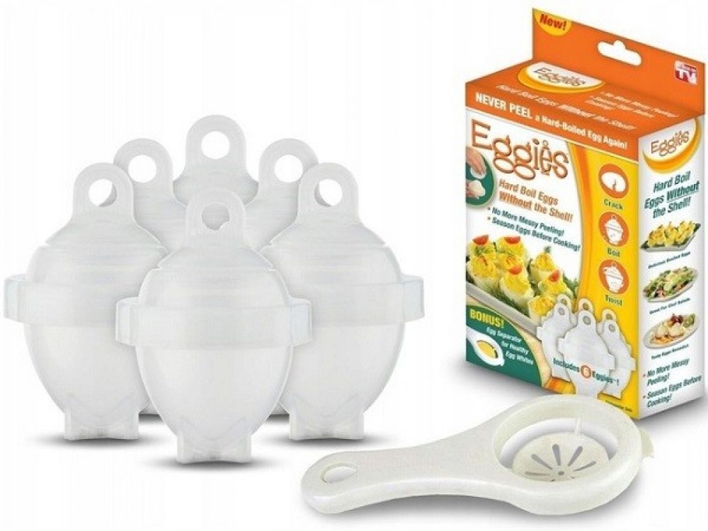 Okouzlíte každou návštěvu dokonale uvařenými vajíčky. Vyniknou na obložené míse, předkrmech, jako příloha k polévce, či na chlebíčcích. Nádobky Eggies uvaří svoje vajíčka stejně jako kdyby byly ve skořápce a jejich nepřilnavý vnitřek se postará o to, aby se hotové uvařené vajíčko posunulo mírně doprava. Takže speciální design nádobky vaří vajíčko na dně, od nynějška se Vám bude dát uvařené vajíčko mnohem snadněji upravit i po estetické stránce. Vychutnejte si fantastické vajíčka, aniž byste museli loupat skořápku! Připravte si vajíčkové saláty, obložené mísy nebo si jednoduše nakrájejte vajíčko na talíř. Loupat vajíčka tradičním způsobem může být někdy pořádně otravné a výsledek vůbec nevypadá dobře. Ale pokud použijete nádobky na vaření vajíček Eggies, budete to mít hotové za několik sekund! A protože v nich vaříte vajíčka bez skořápky, můžete je už během vaření dochutit kořením nebo solí.