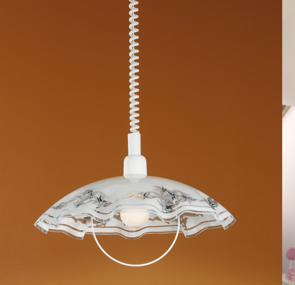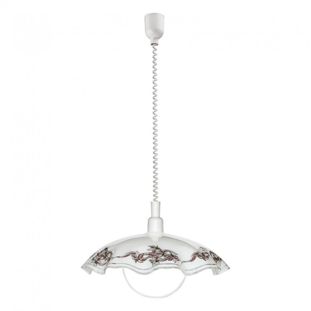 Přehled závěsného svítidla VETROZávěsné svítidlo VETRO se pyšní kulatým stínidlem z bílého satinovaného skla s vlnitým okrajem, které je zavěšeno na bílém plastovém baldachýnu. Stínidlo je doplněno květinovým dekorem v odstínech fialové a černé, který elegantně završuje hravý design svítidla. Díky spirálovému kabelu a kovové konzoli na stínidle lze snadno upravit výšku svítidla podle individuálních potřeb. Toto závěsné svítidlo se skvěle hodí do klasických interiérů ve venkovském stylu a poskytuje jedinečné osvětlení v kuchyni nebo v jídelně nad jídelním stolem. Žárovka není součástí dodávky, avšak svítidlo je kompatibilní s jakýmkoli světelným zdrojem se závitem E27.