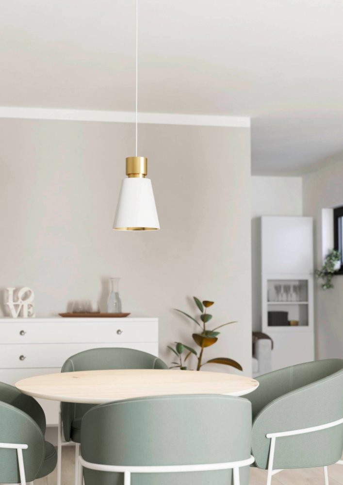 - Svítidlo je vyrobeno z oceli v mosazné barvě a textilie v bílé a mosazné barvě.
