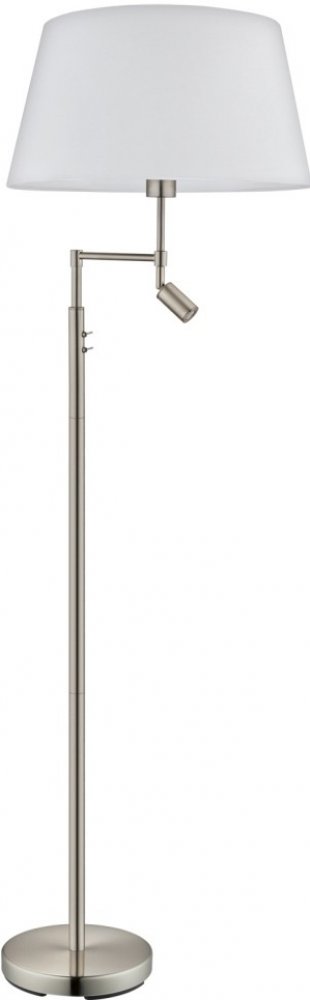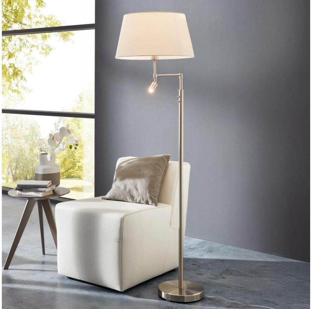 Stojací lampa SANTANDER je vybavená menším bodovým LED světlem, které si můžete nasměrovat dle potřeby a skvěle se hodí například ke čtení. Svítidlo tvoří ocelové tělo v úpravě matný nikl a textilní stínidlo na hlavním světle, které vytváří příjemné intimní osvětlení. Ovládá se vypínačem umístěným na těle svítidla. Hlavní světlo je vybavené paticí E27, vhodný zdroj si můžete vybrat z naší nabídky.