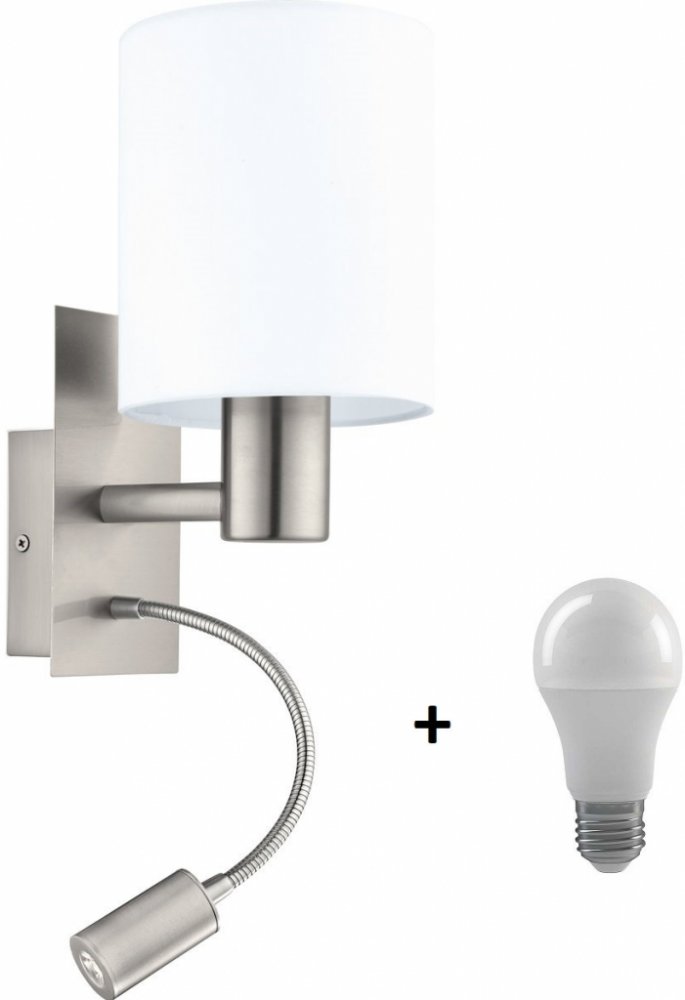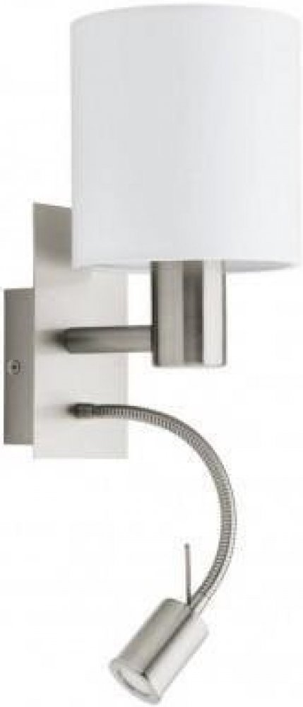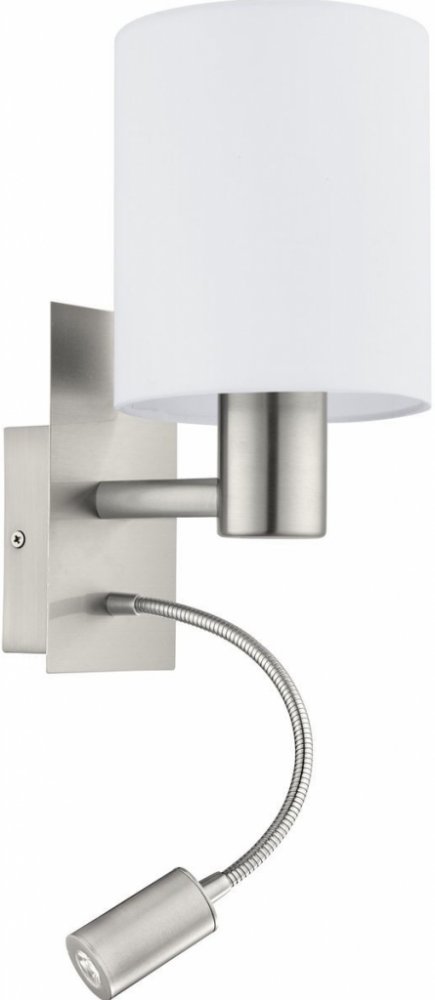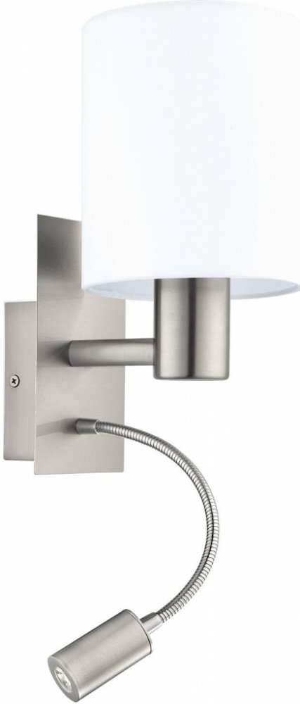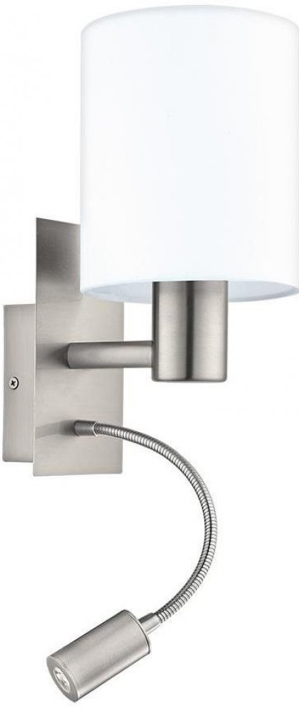 Nástěnné svítidlo pochází z řady PASTERI. Konstrukce je vyrobena z oceli a má povrchovou úpravu v matném niklu. Je osazeno dvěmi světelnými zdroji. Hlavní světelná část je určena pro žárovku s paticí E27, limitováni jste pouze příkonem 40W. Tu zdobí textilní, bílé stínítko. Druhá světelná část je vybavena flexibilním ramenem a je vybavena integrovanou LEDkou, která svítí 380lumeny. Na spodní straně svítidla, jsou umístěny dva vypínače. Jeden je na žárovku E27 a druhý je na LED zdroj.Skvěle se hodí do ložnice jako lampička na čtení. Díky flexibilnímu rameni, si můžete nastavit úhel světla, jak budete potřebovat.Kombinujte s ostatními svítidly ze shodné série PASTERI.