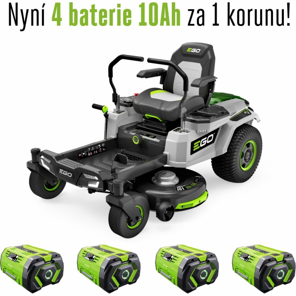 Při koupi zahradního rideru nyní automaticky obdržíte 4 kusy 10Ah baterie BA5600T za 1 korunu. EGO Z6, ZT4201E-L disponuje třínožovým žacím zařízením šíře 107 cm. Tři rotující žací nože disponují každý svým bezuhlíkovým elektromotorem o výkonu, odpovídajícímu výkonu strojů poháněných spalovacím motorem o výkonu 24PS, ale s podstatně menšími ztrátami. Pojezd stroje je variabilní ve 3 jízdních režimech v rozmezí 0 - 13 km/h. Směr jízdy je ovládán dvěma ovládacími pákami a konstrukce stroje umožňuje otáčení rideru zcela na místě.