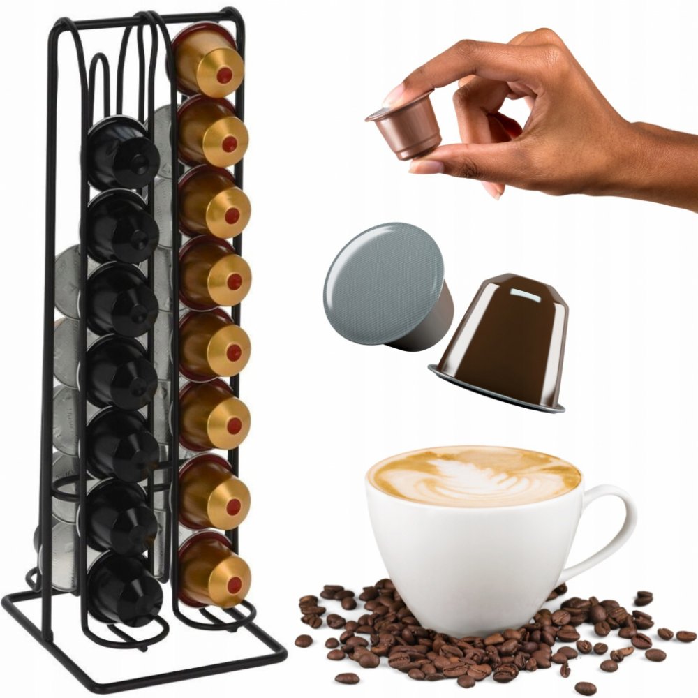 Do černého kovového stojan na kávové kapsle se pohodlně vejdou například kapsle značky Nespresso nebo kapsle stejné velikosti jako Nespresso. Tento stojan na kapsle naopak rozměrově neodpovídá kávovým kapslím značky Dolce Gusto, které do něj tedy nepasují.