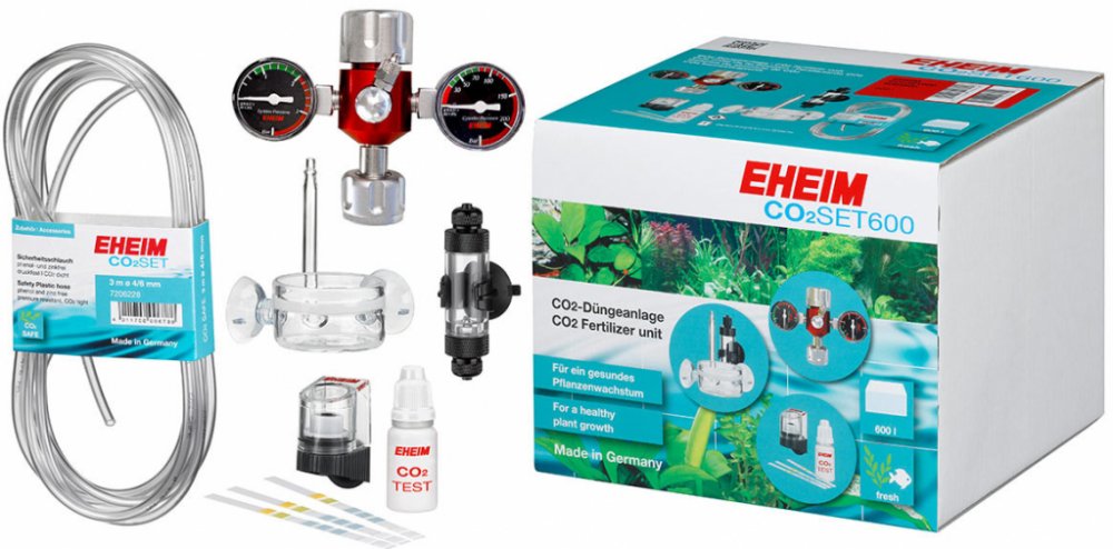 Kompletní sada EHEIM CO 2 – Dávkovací systém pro akvária do 600 litrů. Tato kompletní sada CO 2 dodává vašemu akváriu přesné množství oxidu uhličitého, které je potřebné k zajištění jedné z nejdůležitějších živin pro vaše rostliny. Přesné dávkování CO 2 je spojeno s nepřetržitým monitorováním a maximální bezpečností. Proč si pořídit kompletní sadu CO 2 ? Potřebné vybavení součástí balení a rychlá instalace Sada je dodávána se všemi nezbytnými doplňky a lze ji v několika jednoduchých krocích nastavit pro okamžité použití. !Pro správné fungování sady je zapotřebí mít CO 2 láhev! Redukční ventil Redukční ventil snižuje tlak v lahvi z 64 barů na provozní tlak 1,5 až 2 bary v závislosti na teplotě v místnosti. Kvalita redukčního ventilu určuje přesnost a spolehlivost hnojení CO 2 . Požadované množství CO 2 (počet bublinek) se nastavuje pomocí počítadla bublinek. Testovací sada CO 2 Kompletní sada pro neustálé sledování obsahu CO 2 v akváriu, včetně dlouhodobého testu, indikátorové kapaliny a 5 testovacích proužků pro analýzu hodnot vody. V závislosti na uhličitanové tvrdosti (dKH) vody se na stupnici zobrazí odpovídající hodnoty pH. Technické parametry Sladkovodní voda: Ano Mořská voda: Ne Pro akvária o objemu: 600l Záruka: 3 roky Vyrobeno v Německu Obsah balení Přesný redukční ventil CO 2 s manometry pro opakovaně použitelné systémy a přesný dávkovací ventil Hadicová přípojka otočná o 360° Speciální bezpečnostní hadice CO 2 , odolná proti tlaku, 3 m, ø 4/6 mm Bezpečnostní difuzér CO 2 do 600 l včetně počítadla bublin a zpětného ventilu pro efektivní dávkování CO 2 CO 2 dlouhodobý test a indikátorové činidlo pro neustálé sledování obsahu CO 2 v akváriu 5x testovací proužky k analýze vody !Pro správné fungování sady je zapotřebí mít CO 2 láhev!