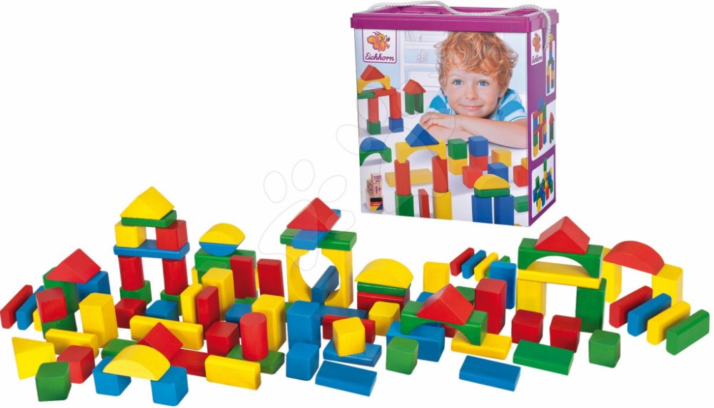 Eichhorn Barevné kostky v kbelíku, 100 prvkůSada 100 dřevěných barevných kostek různých tvarů zabalených v praktickém kbelíku s třídičem tvarů na víku, FSC 100,.Eichhorn Sada 100 dřevěných stavebních bloků zabalených v kbelíku, který je ideální pro skladování. Víko kbelíku má otvory pro třídění tvarů. Klasika, která nesmí chybět žádnému batoleti, díky různým tvarům a barvám stimuluje smysly těch n...
