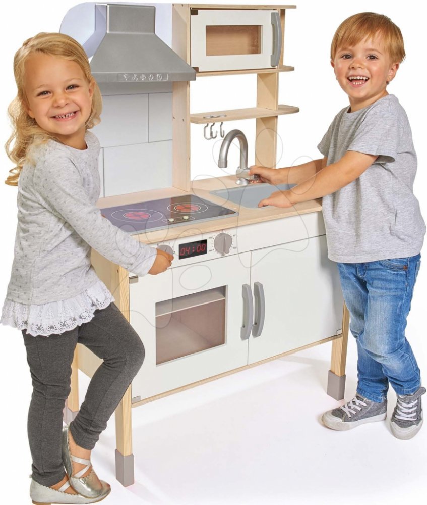 Hrací kuchyňka Eichhorn: Hrací kuchyňka má dvě plotýnky a odpovídající otočné knoflíky s funkcí kliknutí, odsavač par, dřez, troubu a mikrovlnnou troubu - vše, co malí kuchaři potřebují. Po sestavení má hrací kuchyňka rozměry 36x69x99,5 cm. Vhodné pro děti od 3 let. - Hrací kuchyňka se dvěma plotýnkami a odpovídajícími otočnými knoflíky s funkcí klapání, odsavačem par, dřezem, troubou a mikrovlnnou troubou - Sestavená hrací kuchyňka má rozměry 36x69x99,5 cm - Vhodné pro děti od 3 let Dimensions (with packaging): Délka: 18 cm Šířka: 39,5 cm Výška: 75,5 cm Upozornění Nevhodné pro děti do 3 let. Součástí dodávky: Součástí dodávky je sporák s osvětlenými plotýnkami, dřezem, troubou a odsavačem par, nesestavený Hersteller-Artikelnummer: 100002494 V této krásné dřevěné kuchyňce na hraní od společnosti Eichhorn můžete připravovat ty nejlahodnější pokrmy. Kuchyňka je vybavena digestoří, kohoutkem, dřezem, troubou a sklokeramickou varnou deskou, na které to opravdu svítí. Otoč knoflíky a uslyšíš zvuk Výška: 99,5 cm Výška oceli: cca 50 cm Vhodné pro děti od 3 let Exkluzivní příslušenství Funguje na 2 baterie AA (nejsou součástí balení)