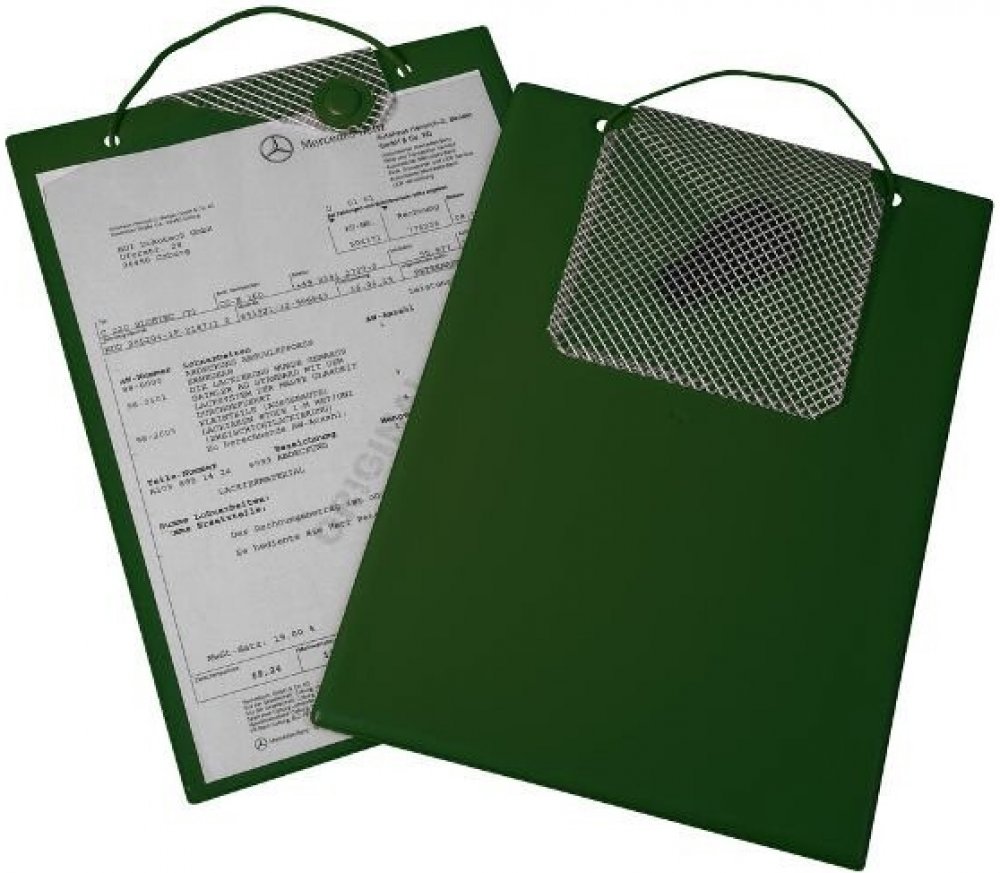 Desky na dokumenty formátu A4 s průhlednou přední fólií, s magnetickým uzávěrem, poutkem na zavěšení a s kapsou na klíče. - do desek lze uložit nejenom zakázkové listy, ale i servisní sešity, knihy s návody k obsluze apod. - stabilní provedení, mohou sloužit jako podložka při psaní nebo vyplňování dokumentů - průhledná přední fólie s vysokou pevností a mechanickou odolností - vrchní magnetický uzávěr - na zadní straně je připevněná kapsa / taštička na uložení klíče z pevné fólie zesílené speciálními vlákny, může se do ní vložit i Osvědčení o registraci vozidla - dodávají se v 6 barvách – modrá, červená, zelená, šedá, žlutá a černá - desky jsou snadno omyvatelné a mají dlouhou životnost - Ideální především pro autoservisy, ale i autopůjčovny, firmy s flotilami vozidel atd.