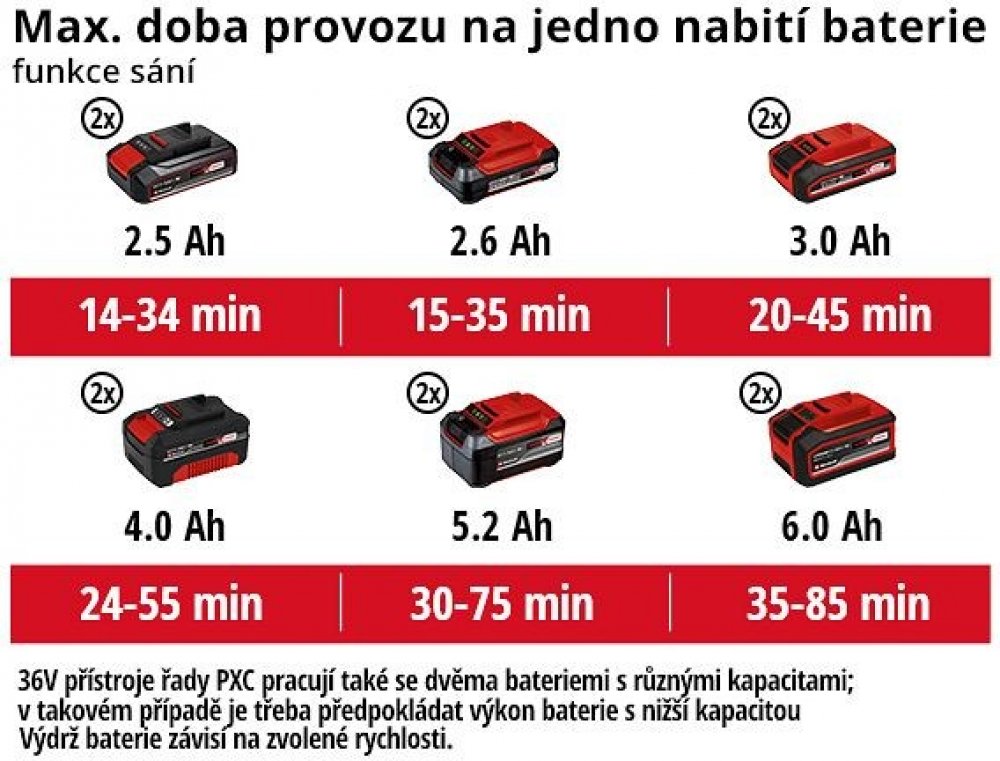 Bezdrátový vysavač na listí spadá pod aku program Power X-Change, proto využijete úplnou flexibilitu díky vysoce výkonným bateriím. Každou dobíjecí baterii PXC (Power X-Change) můžete kombinovat s jakýmkoliv systémovým zařízením z tohoto programu. K provozu aku vysavače listí potřebujete dvě 18 V baterie. Ty nejsou součástí balení a musíte si je dokoupit samostatně.