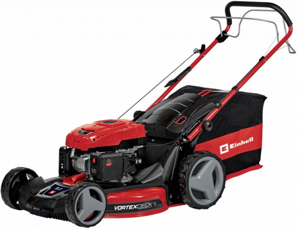 1válcový čtyřtaktní motor OHV Einhell Odpojitelný pohon zadních kol se značkovou převodovkou GT Einhell Vortex technologie í nastavení výšky sečení Koncept řídítek Einhell včetně polohy pro čištění a skladování skládací dlouhá rukojeť s měkkou rukojetí Velký koš na trávu s indikátorem hladiny…